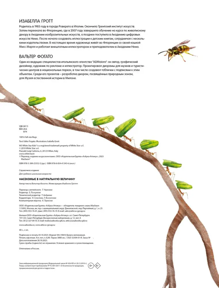 Кто крупнее – жук-геркулес или рогач-жираф? Почему богомола так назвали? Где живёт большая гарпия? На страницах этой книги ты можешь увидеть удивительных насекомых нашей планеты – мадагаскарскую комету, королевскую ореховую моль, жука-голиафа, белостому, рассмотреть жало бумажной осы, заднее крыло перуанского кузнечика, пчелиные соты. Большинство рисунков выполнено в натуральную величину! Книга содержит много интересной информации об ареале обитания насекомых, их размерах, особенностях, а также о способах маскировки от хищников. Рассмотри насекомых поближе и прочти факты о них: тебе откроется много секретов природного мира!