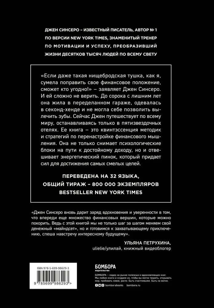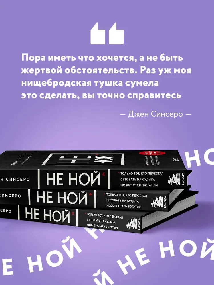 Вторая книга от автора искрометного «НИ СЫ. Будь уверен в своих силах и не позволяй сомнениям мешать тебе двигаться вперед» (в оригинале You are badass). На западе она уже 80 недель держится в Топ-15 самых продаваемых книг Америки. Русскоязычная версия, согласно рейтингу «Читай-города», входит в Топ-3 книг по саморазвитию. «НЕ НОЙ» — ничуть не уступает первой книге Джен Синсеро. В ней автор проводит для читателей ментальный мастер-класс по улучшению финансового положения. Она помогает выявить скрытые убеждения и страхи, которые мешают увеличить свой доход, и предлагает серию несложных упражнений. Но даже если вы успели решить денежные проблемы, эту книгу тем не менее стоит прочитать. Как все написанное Джен Синсеро, она заставляет смеяться до слез, вызывает прилив вдохновения и придает сил для глобальных изменений в своей жизни.
