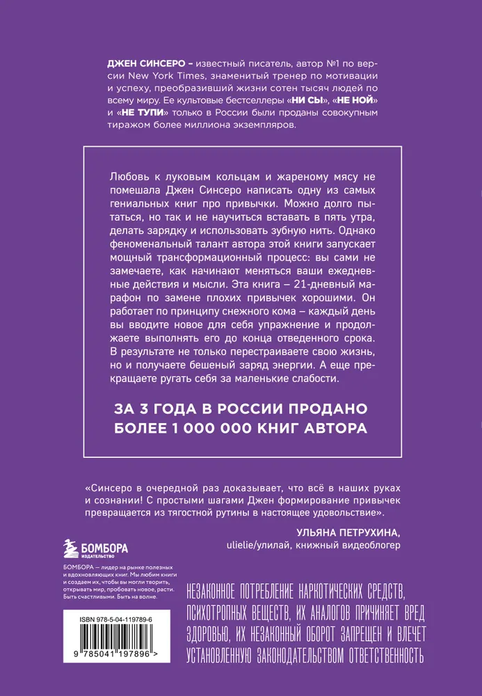 Джен Синсеро — известный тренер по мотивации и успеху, её книги расходятся миллионами экземпляров. Это руководство даст мощный стимул всем, кто хочет что-то изменить в своей жизни к лучшему. Можно долго настраиваться на ранние подъемы, зарядку, пробежки, но так и не научиться получать от этого удовольствие и сформировать долгожданную привычку.На помощь приходит эффективная методика автора: вы сами не замечаете, как происходит трансформация вашего сознания и действий.Эта гениальная книга поможет за 21 день заменить плохие привычки на хорошие по принципу снежного кома: ежедневно вводится новое упражнение, которое выполняется до финального этапа. Шаг за шагом вы заряжаетесь жизненной энергией и вместо тягостной рутины в результате получаете настоящее удовольствие!