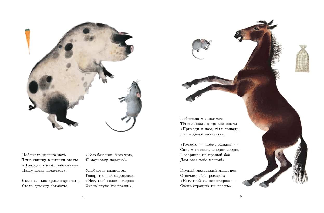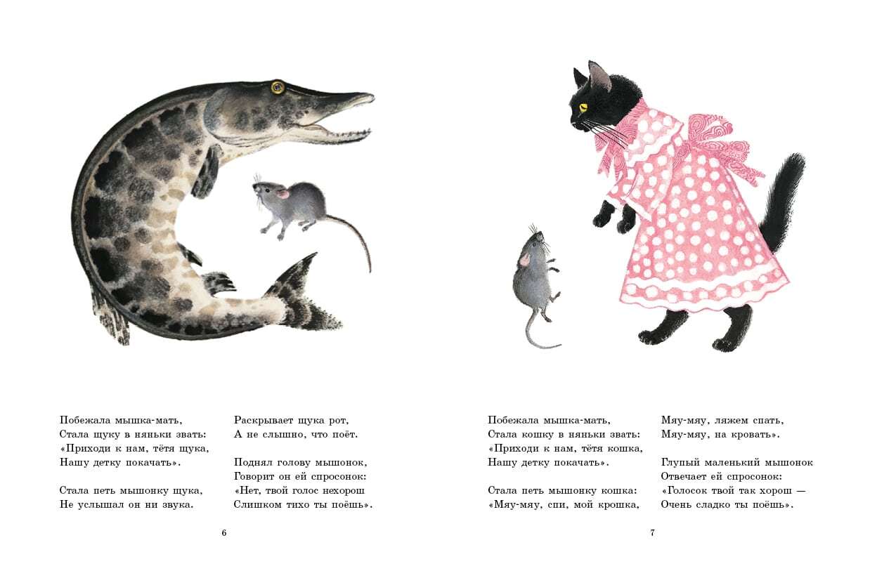 Терпеливая, но не очень умная мама-мышь уступает капризам сына, который никак не хочет засыпать, и оправляется на поиски няни. Малыш не желает видеть в роли няньки ни утку, ни жабу, ни свинью, ни лошадь, ни щуку и, в конце концов, выбирает кошку. История про маленького привереду заканчивается многоточием: «Прибежала мышка-мать, поглядела на кровать, ищет глупого мышонка, а мышонка не видать…