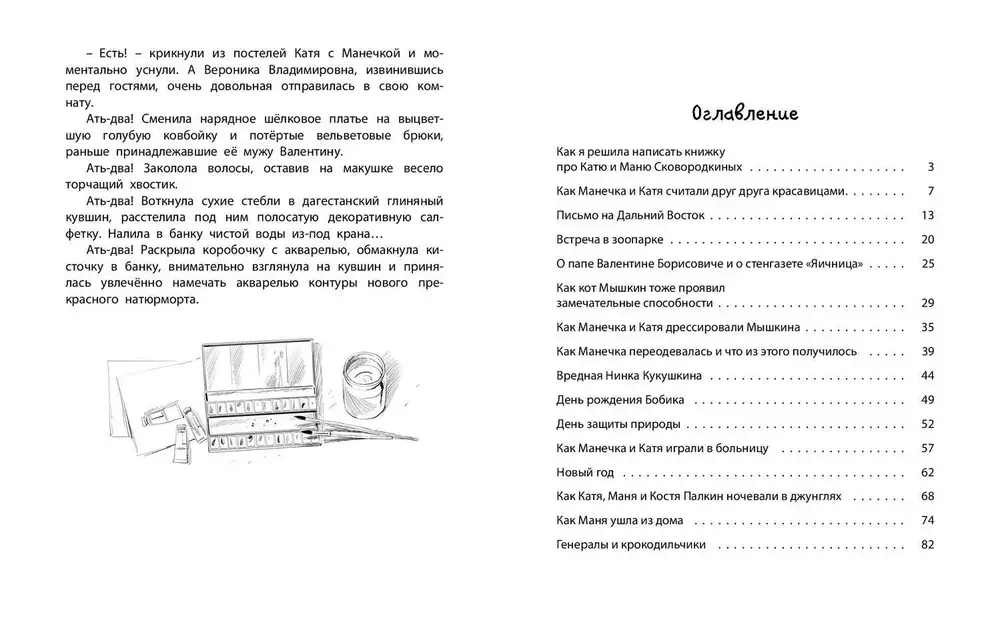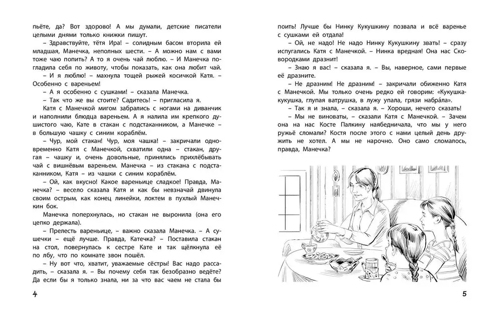 Однажды две неразлучные сестрички Катя с Манечкой зашли на чашку чая к своей соседке тёте Ире и рассказали о том, как они живут. О своих играх и проделках, друзьях и соседях, о вредном коте и преданной собаке… Много интересного рассказали! А тётя Ира была знаменитой детской писательницей Ириной Пивоваровой. Она внимательно выслушала Катю с Манечкой, а потом написала про них книжку, такую же весёлую и озорную, как и сами девчонки.