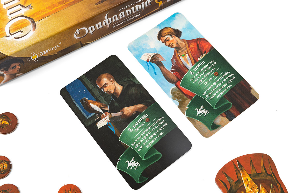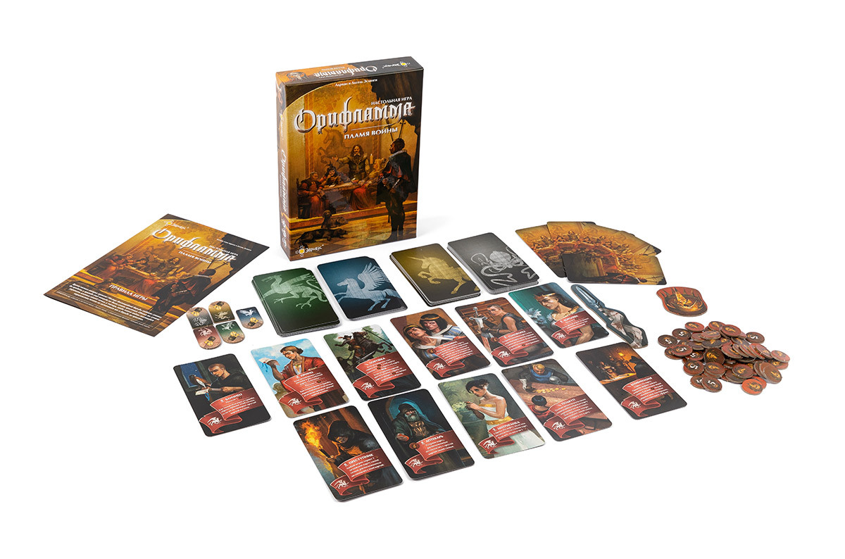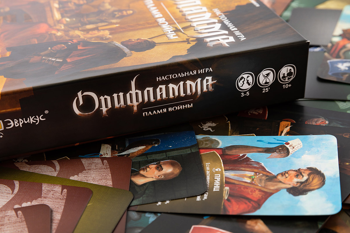 "Орифламма. Пламя войны" — вторая часть игры "Орифламма". Она является независимой игрой в серии, которая по желанию может быть объединена с первой игрой "Орифламма" в одной партии. В игре "Орифламма. Пламя войны" не только новые карты персонажей и интриг, но так же и новые механики, например, подкуп персонажей и подмена персонажей чужой семьи своими. По прежнему победитель игры определяется по количеству накопленных очков влияния. Кратко о ходе игры. Все игроки получают одинаковый набор из 11 карт. Одну карту "Близнец" каждый игрок кладёт перед собой, а из 10 оставшихся карт игроки случайным образом отбирают по 7 карт. Пока карта "Близнец" лежит перед игроком, она не в игре. Она может войти в игру только посредством эффекта карты "Принц". 1. Фаза планирования Все игроки по очереди выкладывают по одной карте из руки в общий ряд событий в центре стола. Карту можно положить лицом вверх или лицом вниз. Это позволяет строить ловушки и удивлять соперников неожиданными эффектами в ходе игры. Каждая карта обладает своим эффектом, например, атаковать, реагировать на атаку, приносить жетоны влияния, переместить карты в ряду событий и др. 2. Фаза событий Применяются эффекты карт в ряду событий, начиная с крайней карты ряда в соответствии с направлением маркера очерёдности событий. Если карта лежит лицом вниз, то владелец решает открыть ее и активировать эффект или оставить закрытой и накопить на ней жетоны влияния. Эффекты карт, лежащих лицом вверх, применяются в обязательном порядке. В конце 6 раунда партия заканчивается, победитель определяется по количеству очков влияния. Для кого игра: - друзьям и молодежи, - любителям игр со скрытой информацией, - любителям тактических и остросюжетных карточных игр.