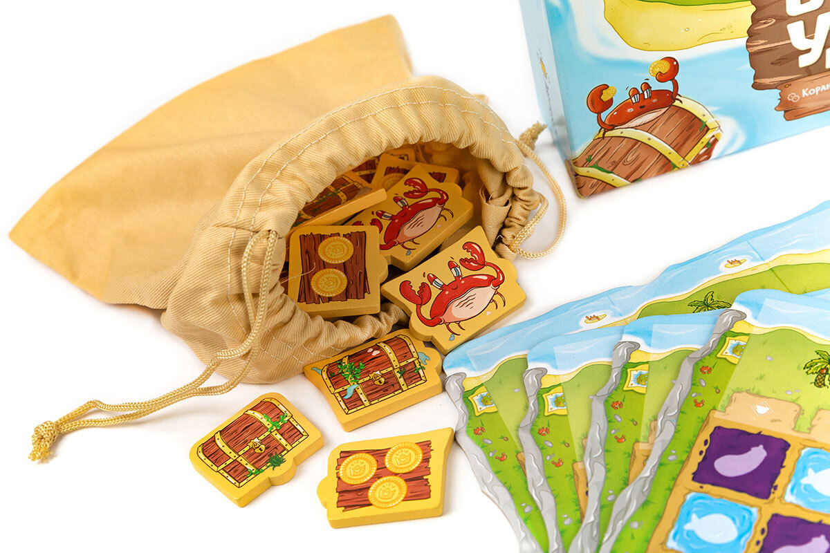 - Собрав снаряжение, вы отправитесь за сокровищами! Сделать это будет просто — вы запустите руку в мешочек и на ощупь достанете один из жетонов с сокровищами (у жетонов разные формы и разная ценность)!