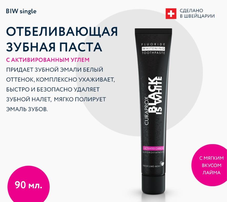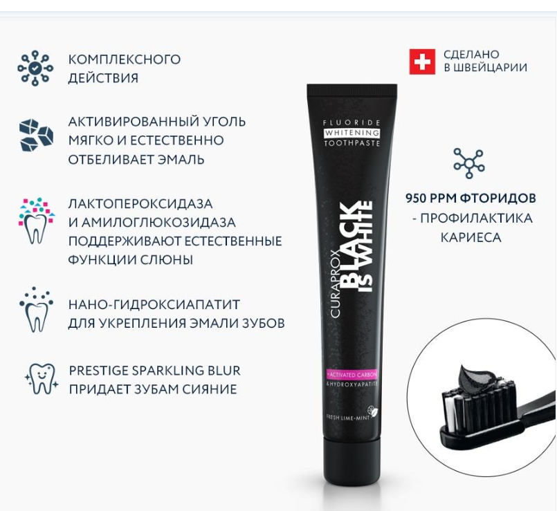 Чёрная зубная паста «Black is White» с активированным углём и мягким вкусом лайма. Паста комплексного действия с фторидами и нано-гидроксиапатитами.Рекомендована: