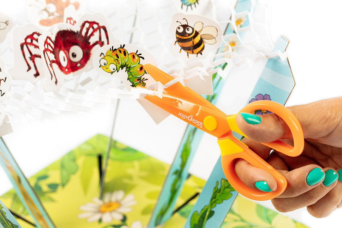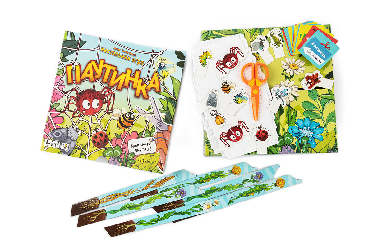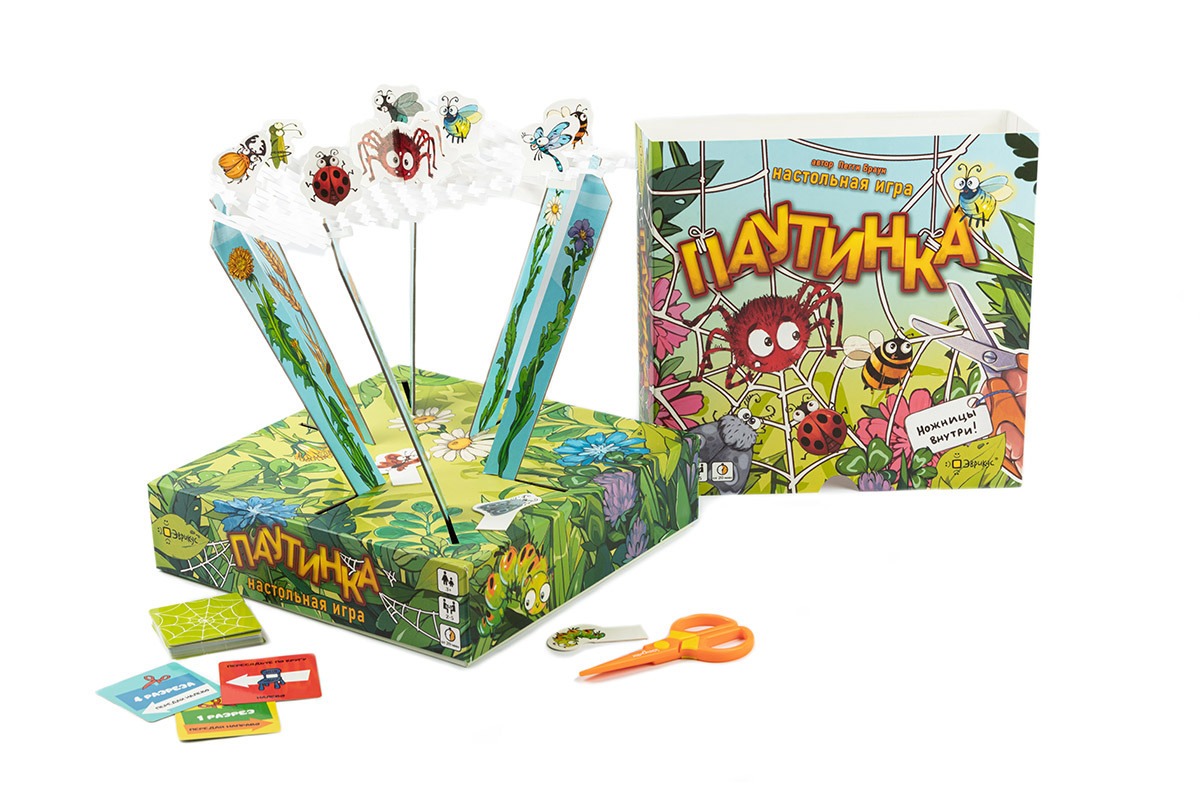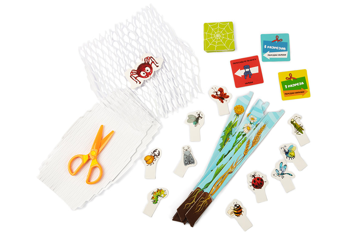 Достаньте из коробки паутинки и цветы-опоры, натяните паутинку и разместите на ней паучка и 10 букашек. По очереди делайте разрезы ножницами, чтобы освободить всех жучков. Осторожно, сам паучок должен оставаться на паутинке! Как только все букашки свободны - вы все вместе выигрываете!