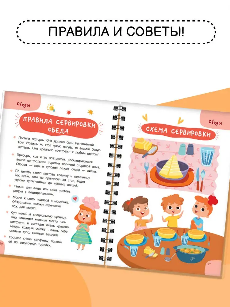 "Первая кулинарная книга: готовлю сам без мамы" — настоящая находка для юных шеф-поваров и их родителей. Это небольшая и удобная книга на спирали, которой легко пользоваться на кухне — выбираешь рецепт, загибаешь страничку, и тебе ничего не мешает! Под обложкой более 60 разнообразных рецептов с пошаговым описанием: завтраки, обеды, ужины, десерты, бутерброды, салаты, напитки и многое другое. Понятные ребенку единицы измерения — стакан, чайная ложка. Яркие иллюстрации, выполненные в стиле современных мультфильмов.