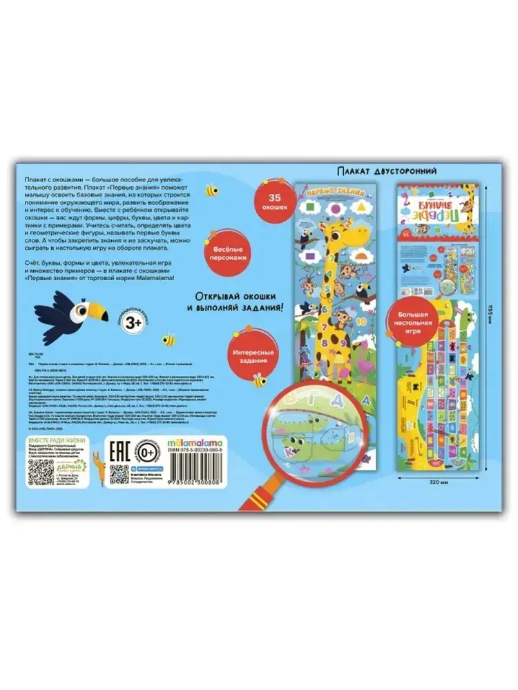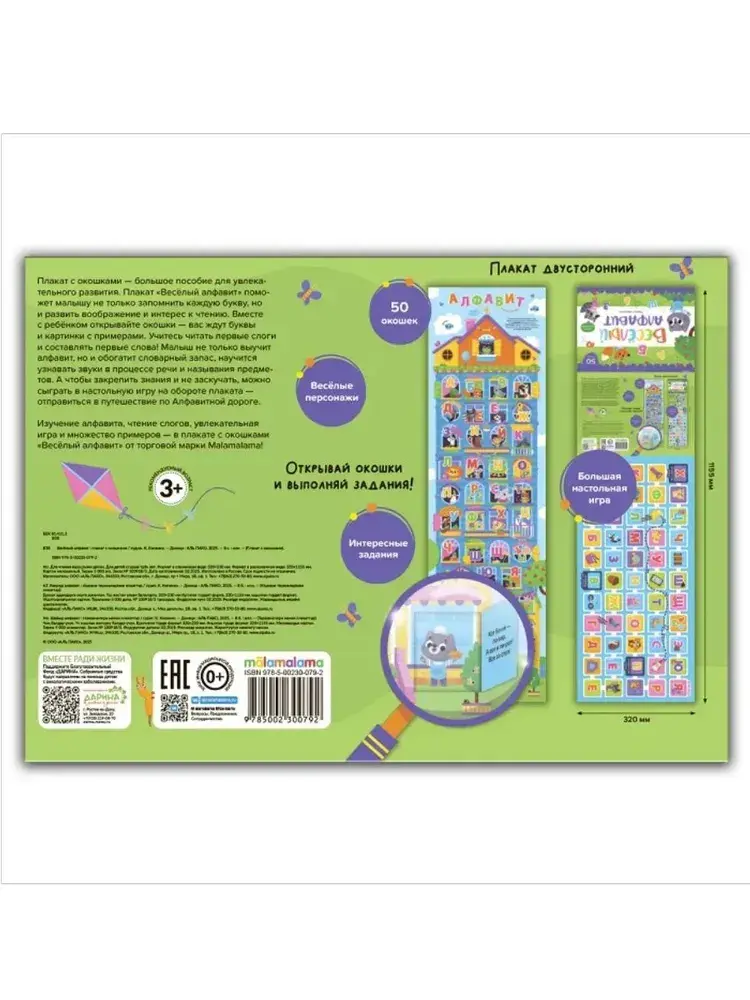 Плакаты с окошками от Malamalama — это уникальный инструмент для получения новых знаний! Плакат «Весёлый алфавит» представляет собой увлекательное пособие для изучения алфавита с разнообразными заданиями и вопросами. Красочные иллюстрации и занимательные окошки стимулируют интерес к занятиям и помогают усваивать информацию в игровой форме. А игра-ходилка на обороте поможет не только выучить буквы, но и весело провести время! Плакат с окошками может служить отличным дополнением к учебному процессу в школе, детском саду или дома. А благодаря яркому дизайну он украсит интерьер любой детской комнаты или класса. Изучать новое весело вместе с Malamalama!