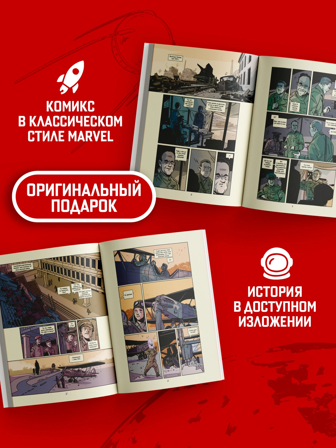 12 апреля 1961 года Юрий Гагарин стал первым человеком в космосе и навсегда вписал свое имя в историю.Однако за легендарным «Поехали!» стояли годы труда тысяч людей: гениальных конструкторов, неутомимых инженеров и работающих в условиях строжайшей секретности ученых. От чертежей Королёва до нервного напряжения в Центре управления полетами в момент старта, этот комикс охватывает все основные вехи на пути советского народа к величайшему из подвигов — покорению неба.Откройте для себя историю удивительных людей, проложивших человечеству дорогу к звездам!