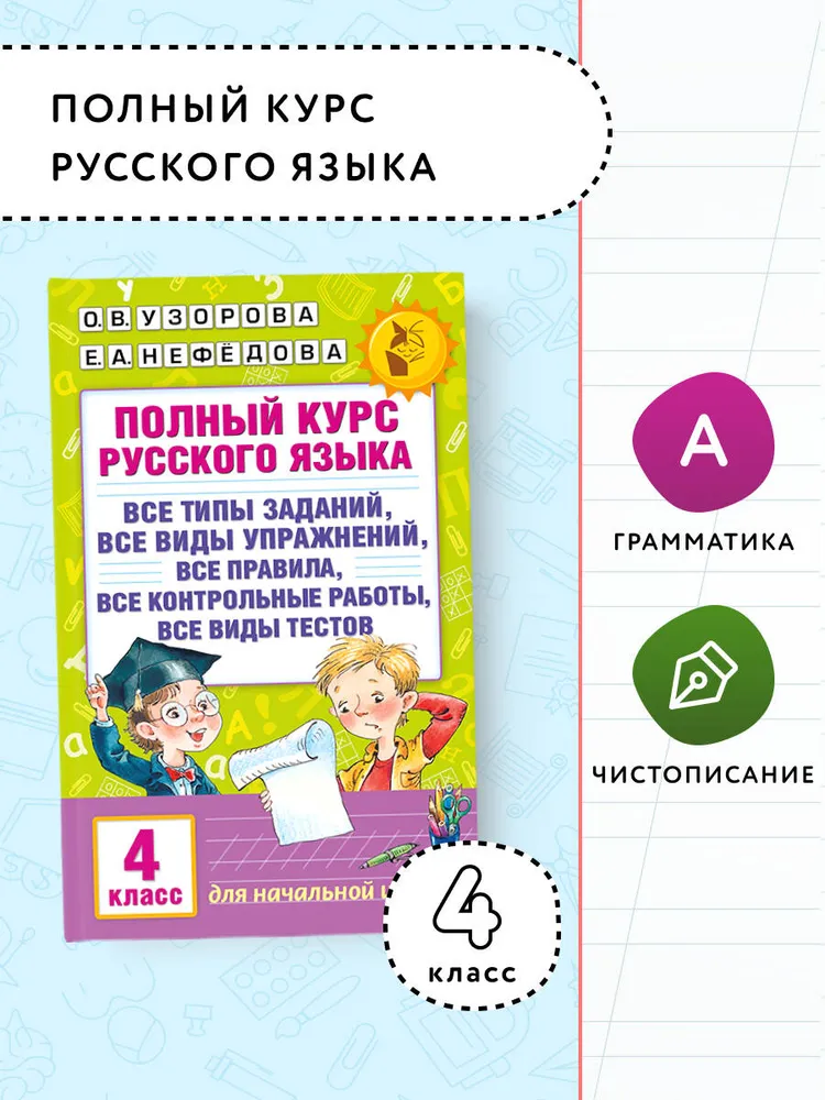 Полный курс русского языка для четвёртого класса содержит все необходимые правила, которые четвероклассник обязательно должен знать, чтобы потом использовать выученную теорию на практике.С помощью разнообразных упражнений, а также контрольных и тестовых заданий ученики лучше осваивают изучаемую тему, тренируют память, повышают орфографическую зоркость и культуру письменной речи.Книгу можно использовать на уроках русского языка, а также для индивидуальной работы дома.