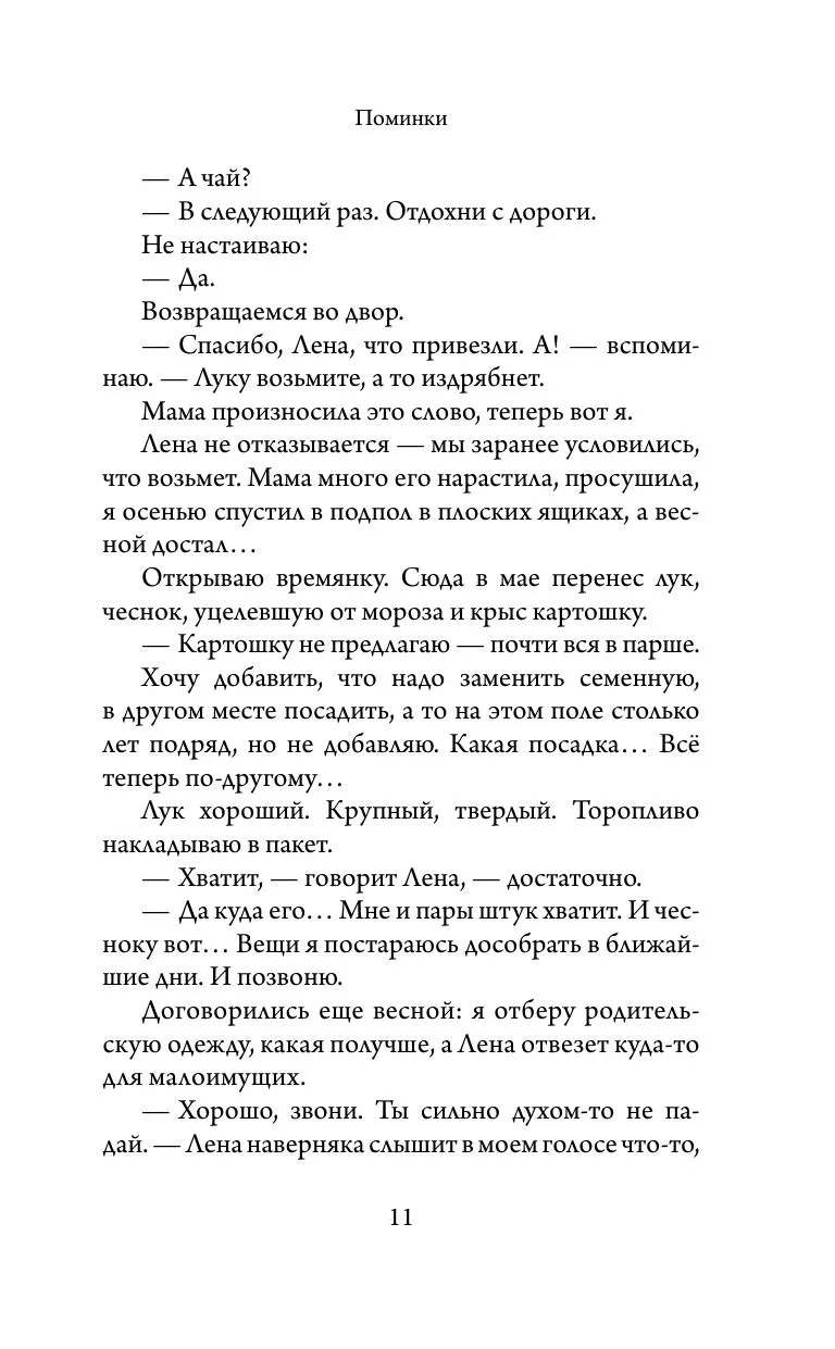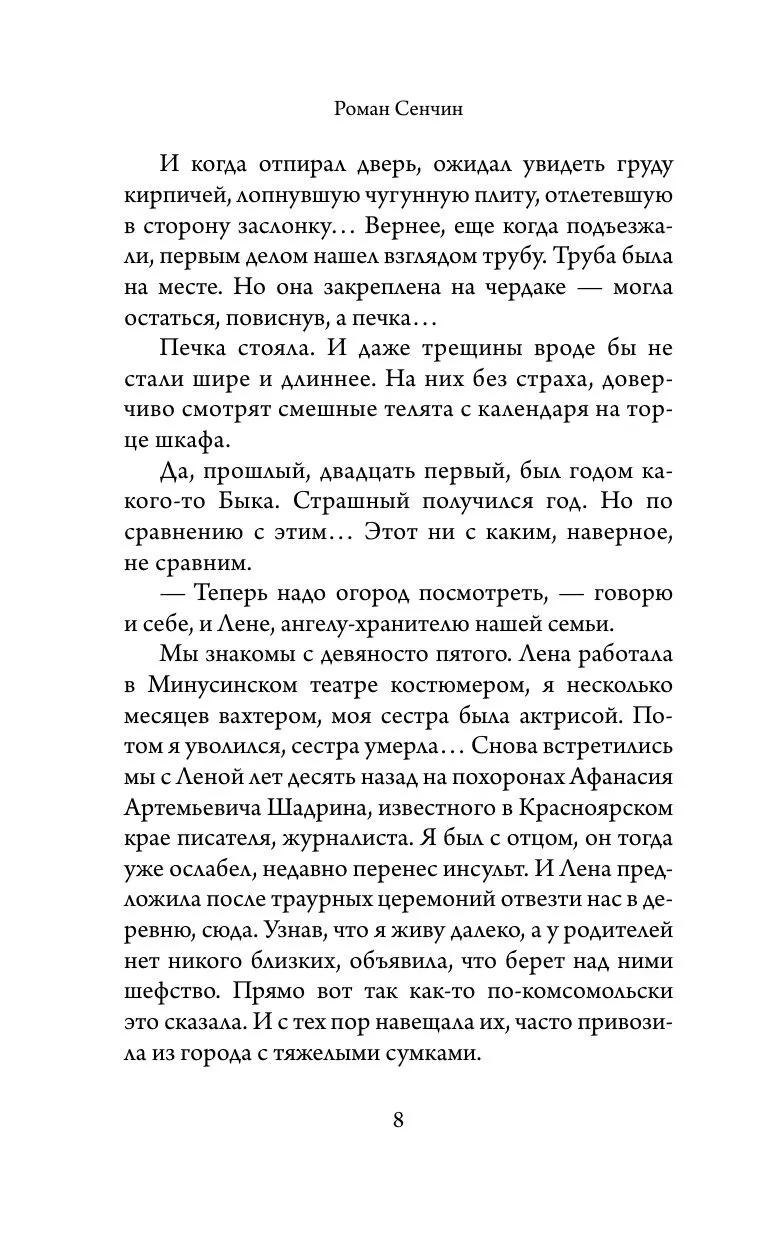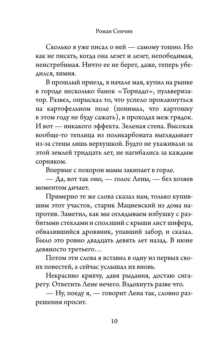 Роман Сенчин (р. 1971) — прозаик, лауреат премий "Большая книга" и "Ясная Поляна". Автор романов "Елтышевы", "Зона затопления", "Дождь в Париже", сборников рассказов "Нулевые", "Девяностые", "Детонация", биографии Александра Тинякова в серии "ЖИЛ".Герой романа, или книги-очерка, как называет ее сам Роман Сенчин, "Поминки" приезжает в дом родителей после смерти матери. Он пытается привести в порядок избушку, подновить забор, собирает ягоды клубники-виктории, которую сажал вместе с родителями, рыбачит в знакомых с юности местах — и вспоминает, вспоминает… Свое детство и погибшую младшую сестру, молодых родителей и их далеких предков, поселившихся в Сибири в начале XX века, переезд в Москву и возвращения, женитьбы и расставания, истории, рассказанные в его книгах, и еще не написанное..."Надо довспоминать. Написать. Записать. Вырубить на бумаге, как вырубали на камне те безвестные, что жили три, пять тысяч лет назад… Да, написать, вырубая на бумаге и отсекая в душе. И поскакать дальше в свои пятьдесят. Начать новый этап в пятьдесят" (Роман Сенчин).