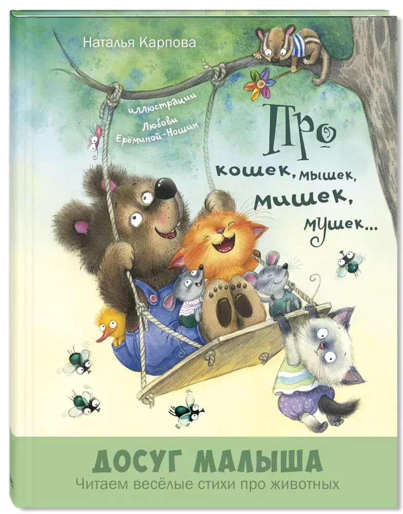 Жизнерадостные, звучные и очень лёгкие стихи Натальи Карповой познакомят малышей с самыми разными животными: хитрым воробушком и непоседливой трясогузкой, отважным зайчонком и перепуганным совёнком, с беззаботным пони и трудолюбивым пауком… А для взрослых эти весёлые стихи – возможность посмотреть на мир глазами детей, увидеть необычное в самых привычных, простых вещах. И детям, и взрослым доставят немало радости очаровательные иллюстрации, автор которых, Любовь Ерёмина-Ношин, знакома нашим читателям по чудесной книжке "Кто нарисовал осень, или Про краски в коляске".