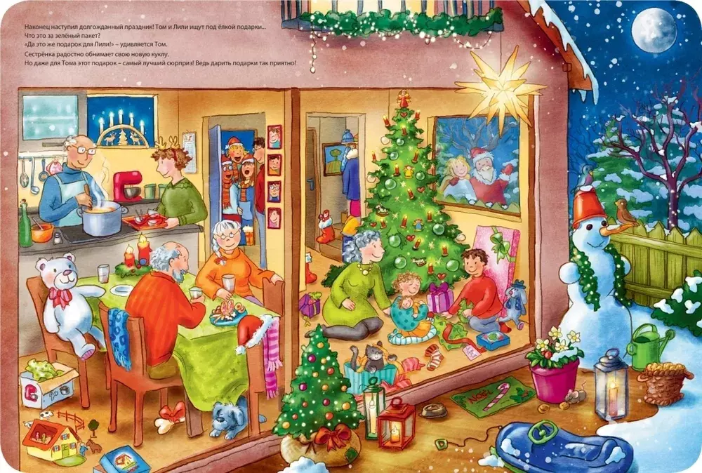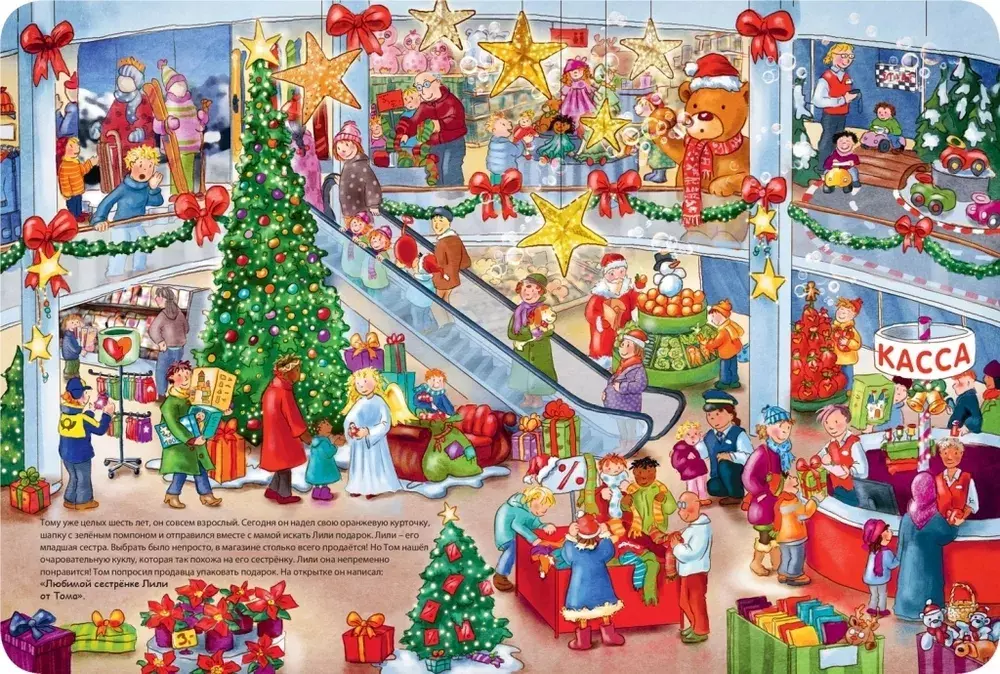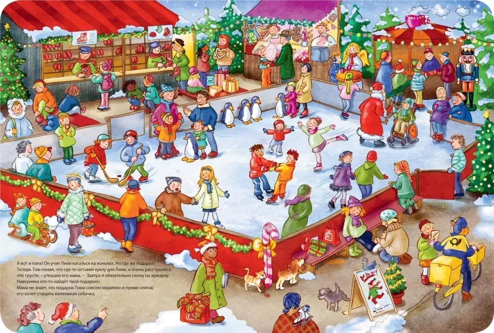 Том нашел для своей любимой сестренки Лили самый лучший на свете новогодний подарок. Его упаковали в шуршащую зеленую бумагу, украсили ярким красным бантом и прикрепили красивую открытку: «Любимой сестрёнке Лили от Тома». Но вот беда, Том случайно оставил подарок на ярмарке. Неужели Лили останется без сюрприза? Конечно, нет! В праздники всегда случаются чудеса… Подарок Тома совершил настоящее путешествие, чтобы в конце концов оказаться под праздничной елкой. Проследи его путь, и увидишь столько интересного! Только смотри очень внимательно!..