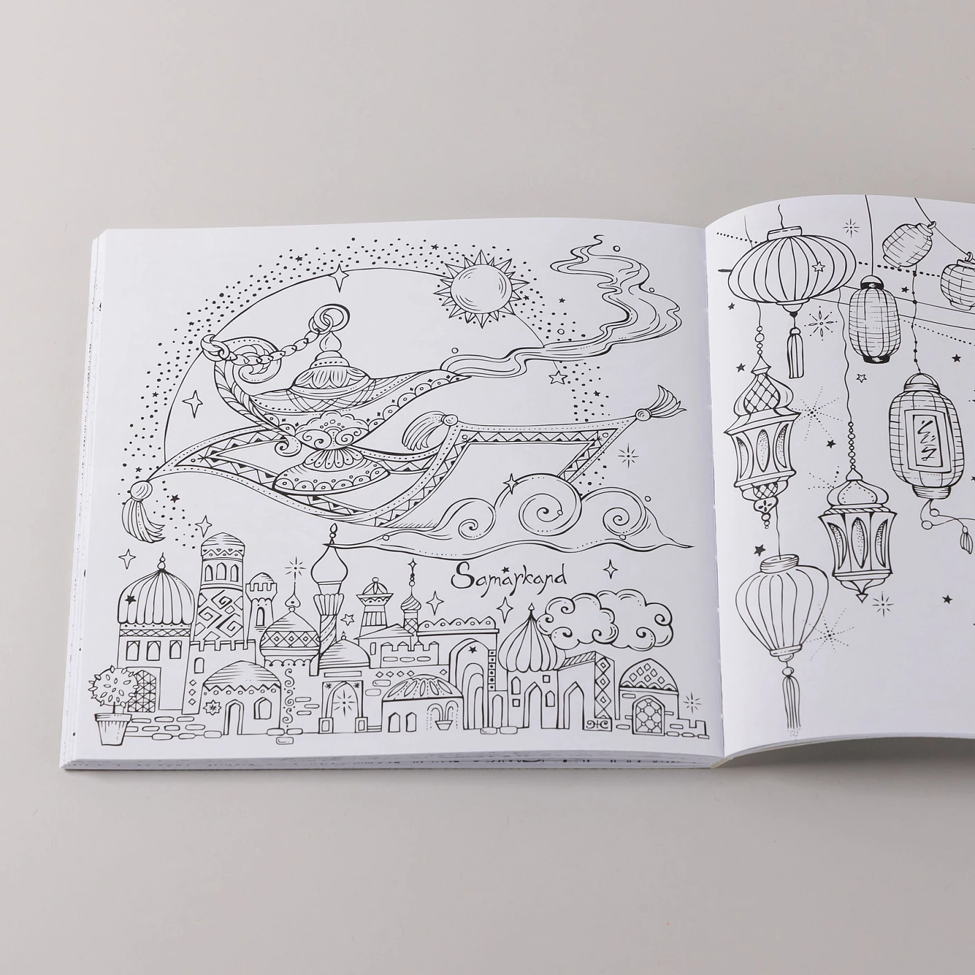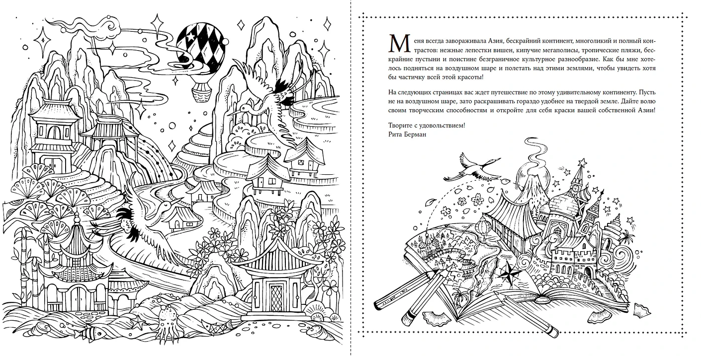 Раскраска Риты Берман перенесет вас в удивительный мир Азии: от Транссибирской магистрали и цветущей японской сакуры через Великую Китайскую стену и тропические пляжи к шумным восточным базарам и волшебной Индии. Эта раскраска-антистресс поможет сделать паузу и отдохнуть после насыщенного дня. Берите карандаши, вдохновляйтесь красотой деталей и творите с удовольствием!