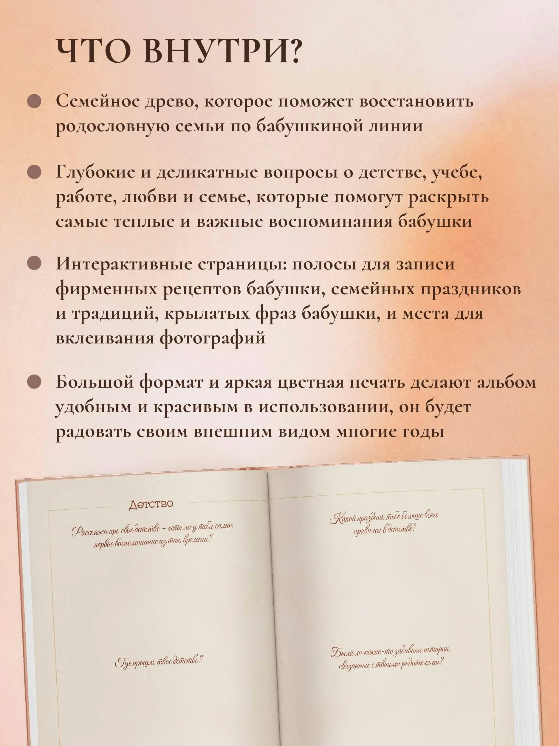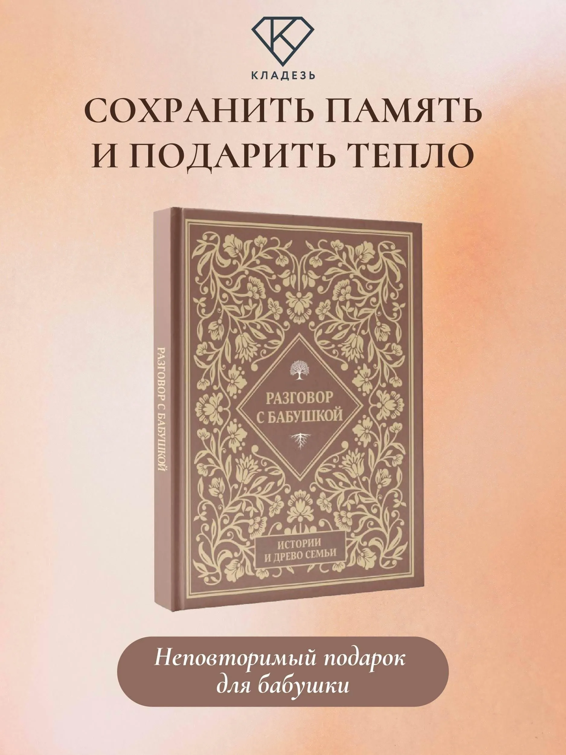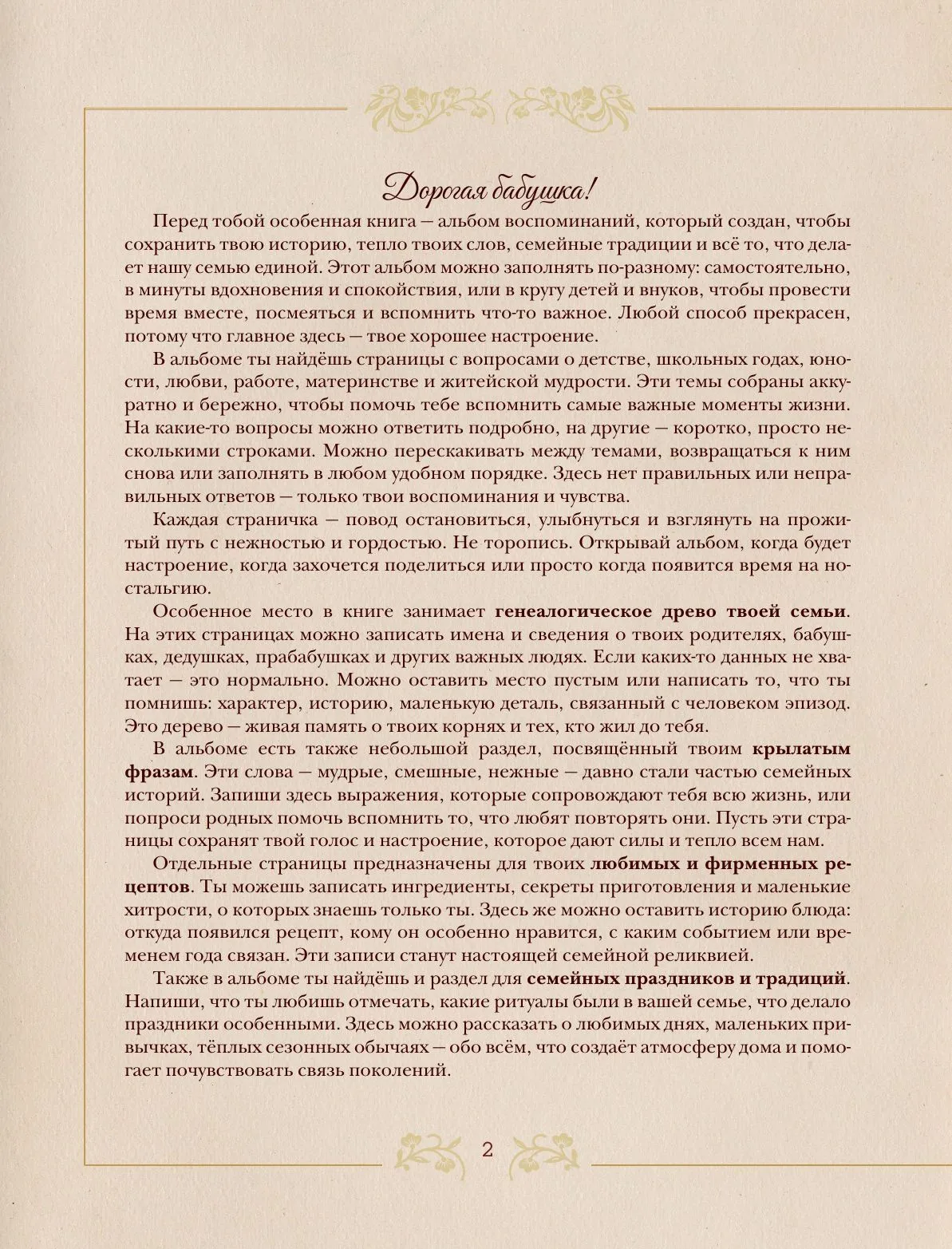 Любимая бабушка!Этот семейный альбом создан для тебя с теплом и благодарностью. Он поможет сохранить бесценные воспоминания и открыть новые страницы твоей жизни. В альбоме собраны вопросы, которые мягко и бережно подведут к важным историям, трепетным моментам и откровениям, которыми ты сможешь поделиться с близкими. Это возможность вместе вспомнить самые светлые события, узнать то, о чём раньше не говорилось, и наполнить семейную историю живыми деталями. Заполняя альбом, ты оставишь для нас частичку себя, а мы сможем ещё ближе почувствовать твою мудрость, доброту и любовь.Этот подарок станет тёплым поводом для общения, объединит поколения и сохранит память, которую будут перечитывать и ценить многие годы.