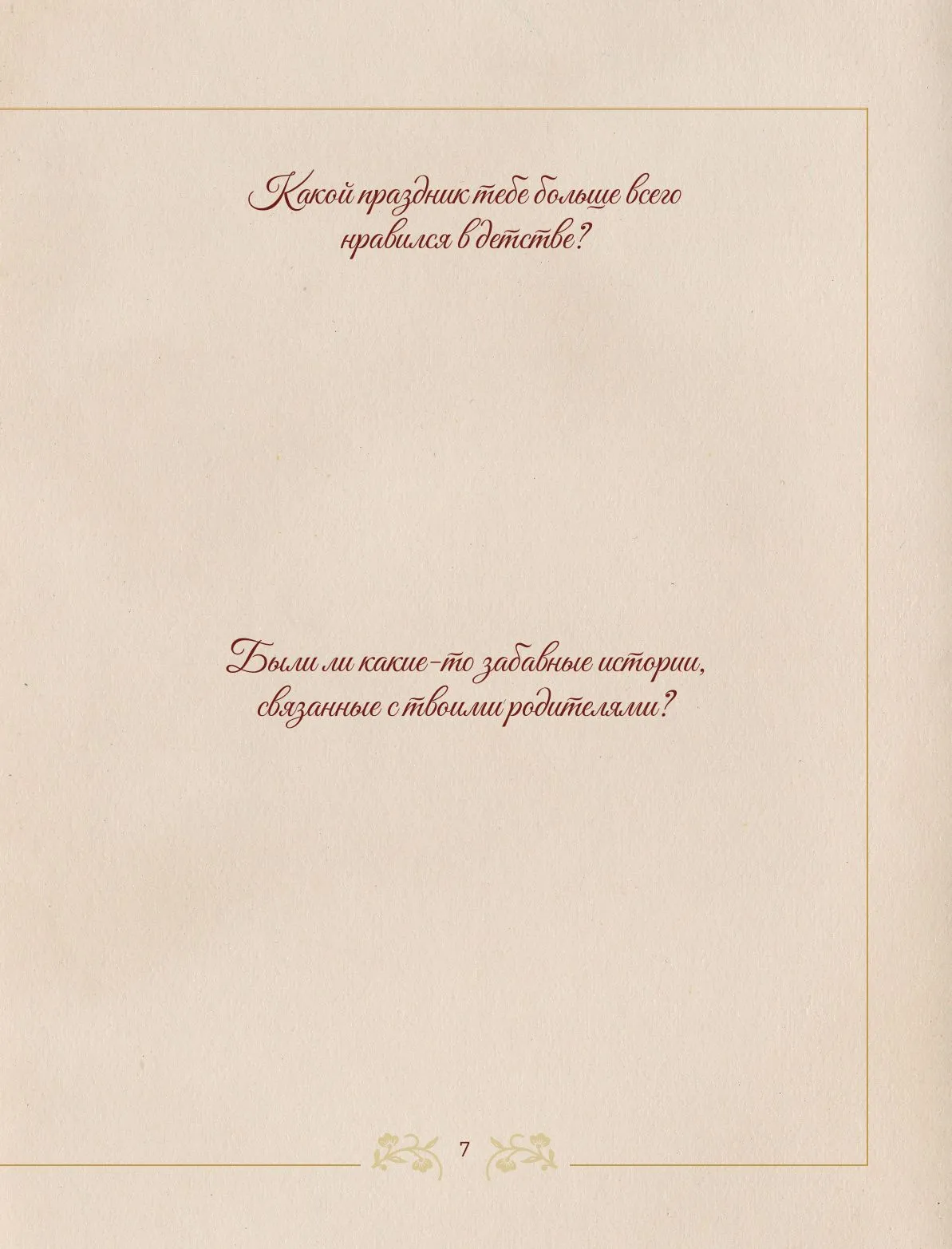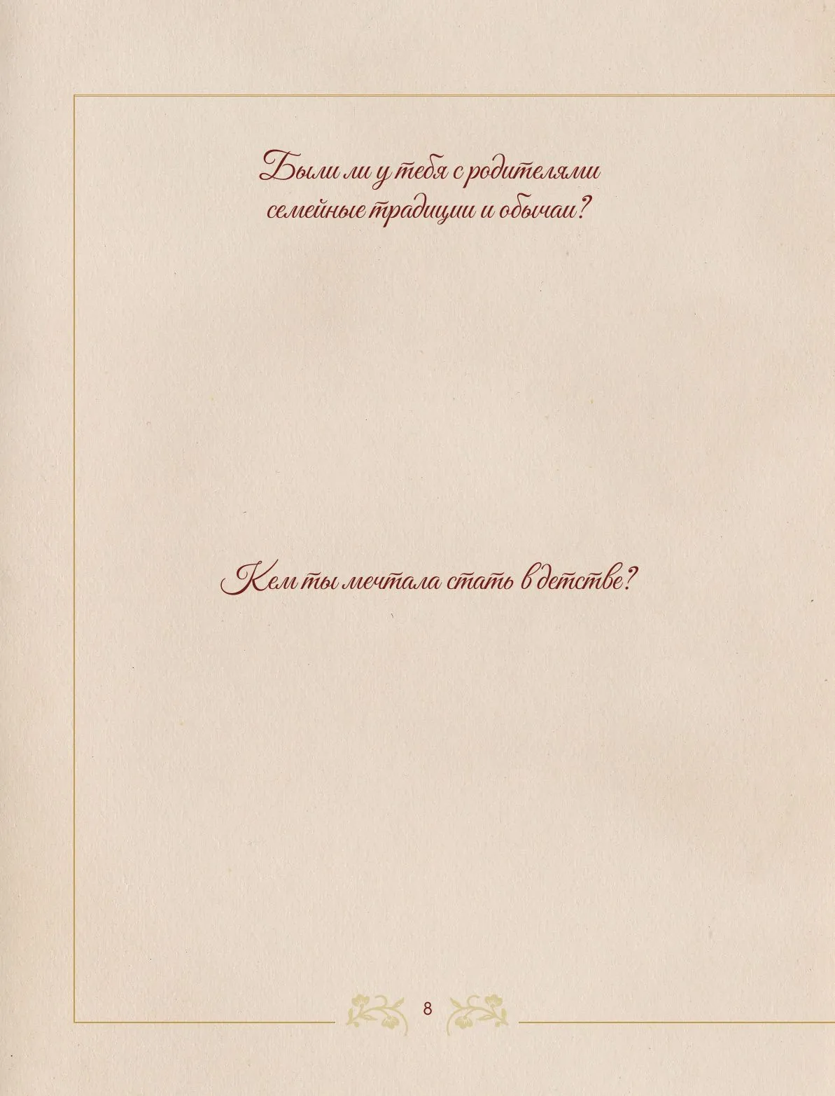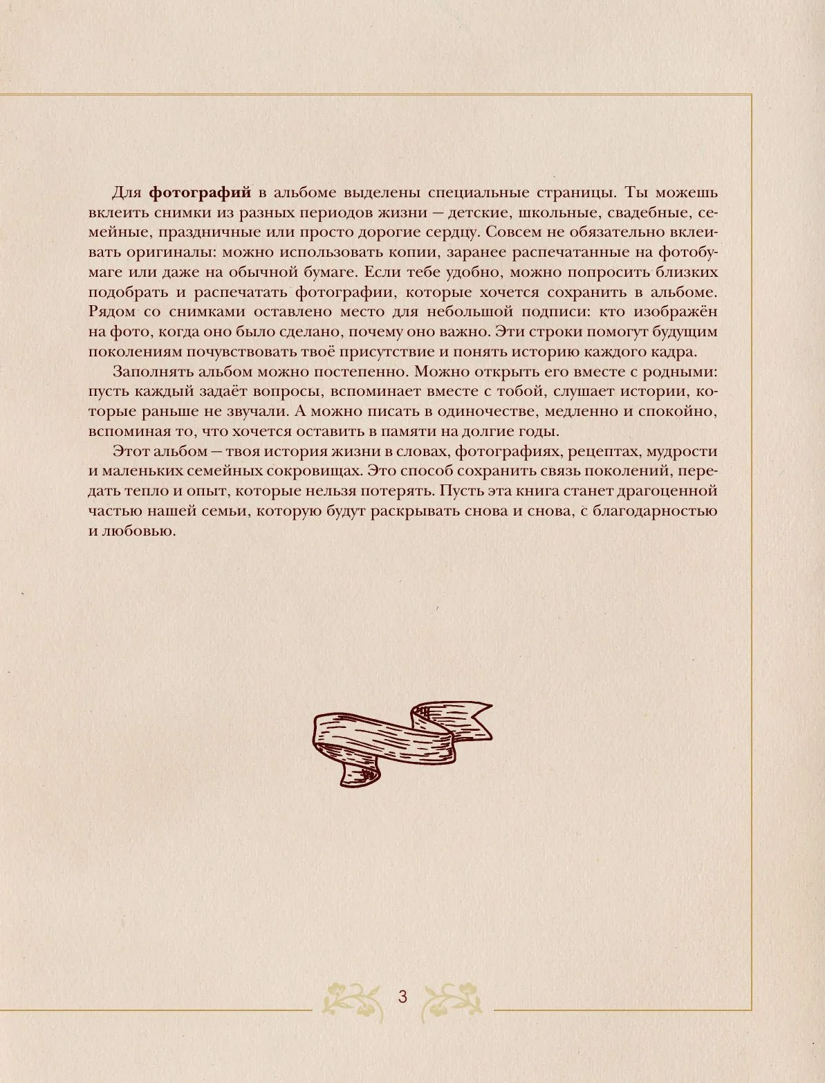 Любимая бабушка!Этот семейный альбом создан для тебя с теплом и благодарностью. Он поможет сохранить бесценные воспоминания и открыть новые страницы твоей жизни. В альбоме собраны вопросы, которые мягко и бережно подведут к важным историям, трепетным моментам и откровениям, которыми ты сможешь поделиться с близкими. Это возможность вместе вспомнить самые светлые события, узнать то, о чём раньше не говорилось, и наполнить семейную историю живыми деталями. Заполняя альбом, ты оставишь для нас частичку себя, а мы сможем ещё ближе почувствовать твою мудрость, доброту и любовь.Этот подарок станет тёплым поводом для общения, объединит поколения и сохранит память, которую будут перечитывать и ценить многие годы.