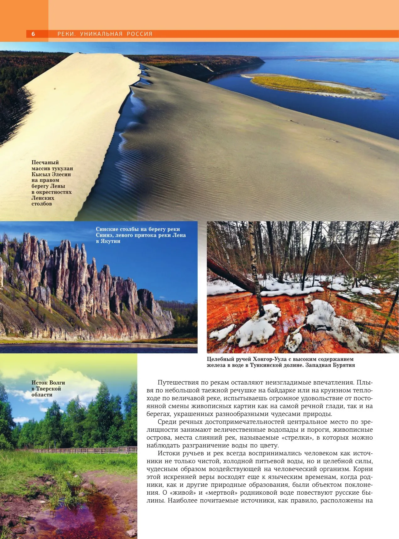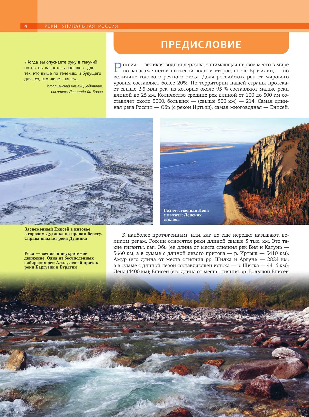 Первое издание, посвященное наиболее выдающимся и уникальным рекам России, включает очерки, сопровождаемые авторскими фотографиями, по таким рекам как: Москве — главной реке Российского государства; великим рекам, протяженность которых превышает 3000 км — Волге, Оби, Енисею, Лене и Амуру; широко известным крупным рекам Оке, Каме, Дону, Северной Двине, Печоре, Кубани, Тереку, Катуни, Ангаре, Уссури. Всего издание включает актуализированные описания более 50 популярных или малоизвестных, но уникальных рек Средней полосы России, Русского Севера, Кольского полуострова, Карелии, Крыма, Северного Кавказа, Урала, плато Путорана, Горного Алтая, Тувы, Хакасии, Саян, Прибайкалья и Забайкалья, Якутии, Камчатки, Командорских и Курильских островов, Приамурья и Приморья. При отборе рек для издания автор руководствовался такими критериями, как живописность, уникальность, популярность.Описание каждой реки, помимо ее основных характеристик (длина, площадь бассейна, местоположения истока и устья, основные притоки) включает также наиболее выдающиеся природные и историко-культурные достопримечательности, расположенные в ее бассейне. К наиболее зрелищным природным чудесам рек относятся: величественные водопады и перекаты, таинственные острова, причудливые прибрежные скалы и береговые геологические обнажения, подступающие к самому берегу дремучие леса, безбрежные степи, раскаленные пустыни. Особое очарование и интерес рекам придают уютные деревни, старинные города с храмами по берегам и шедевры инженерного искусства – ажурные мосты, каналы со шлюзами, гидротехнические сооружения могучих ГЭС.Многие реки, описанные в издании, известны как популярные не только среди путешественников, любителей речных круизов на теплоходах и водных сплавов на байдарках, лодках, рафтах, но и многочисленной армии заядлых рыбаков.Настоящее издание предназначено для самого широкого круга читателей – любителей и почитателей природы России, туристов, школьников, студентов и преподавателей вузов. Оно будет интересно и полезно тем, кто собирается путешествовать по нашей стране, кто любит отдых на природе, или предпочитает путешествовать виртуально, погружаясь в интересное повествование и выразительные фотографии.