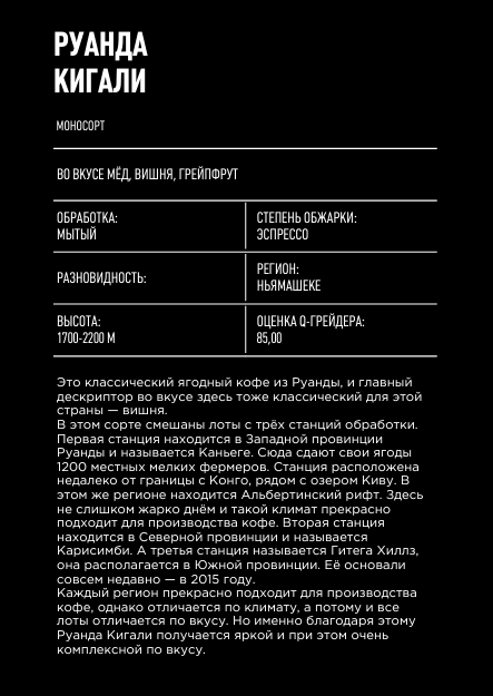 Новый базовый сорт в обжарке для эспрессо, который мы будем стараться поддерживать в нашем ассортименте круглый год. Это классический ягодный кофе из Руанды, и главный дескриптор во вкусе типичный для этой страны — вишня.