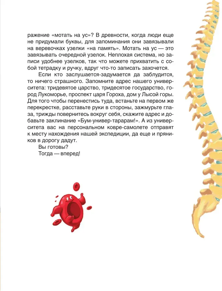 Профессор Витаминкин, заведующий кафедрой анатомии в Университете тридевятого царства, станет вашим проводником в этомьудивительном путешествии. Вы узнаете, почему сердце работает как насос, как мозг управляет всем организмом, зачем нам нужны кости и мышцы и даже почему нельзя есть слишком много сладкого! Царь Горох и его придворные помогут разобраться в строении скелета, а царевна Аграфена объяснит, как работает иммунная система. После чтения вы будете смотреть на свое тело как на удивительный механизм, в котором нет ничего лишнего!
