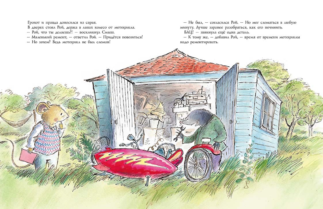 У Роя и летом забот невпроворот. Любимый мотоцикл может сломаться в любой момент. И на всякий случай надо разобрать его на части, чтобы понять, как он устроен. А еще Рой боится упасть с крыши, поэтому на всякий случай залезает на дерево. Но хуже всего то, что за Роем охотится летящее привидение, поэтому он прячется от него под одеялом – на всякий случай. К счастью, рядом добрый и умный Смыш. Он все уладит!