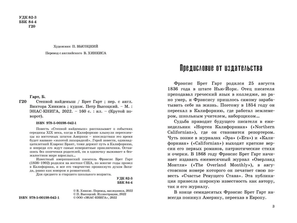 Известный американский писатель Фрэнсис Брет Гарт (1836–1902) родился на востоке США, но многие годы провел в Калифорнии. Из обширного литературного наследия писателя наибольшей известностью пользуются его произведения, описывающие жизнь переселенцев Дикого Запада.