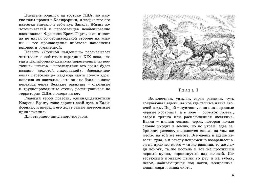 Повесть «Степной найденыш» рассказывает о событиях середины XIX века, когда в Калифорнию хлынули переселенцы из восточных штатов Америки – впоследствии это время будет названо «золотой лихорадкой». Герой повести, одиннадцатилетний Кларенс Брант, тоже держит путь в Калифорнию, и впереди его ждут самые невероятные приключения. Оставшись без попечения родителей, он в одиночку выживает в безжалостном мире взрослых…