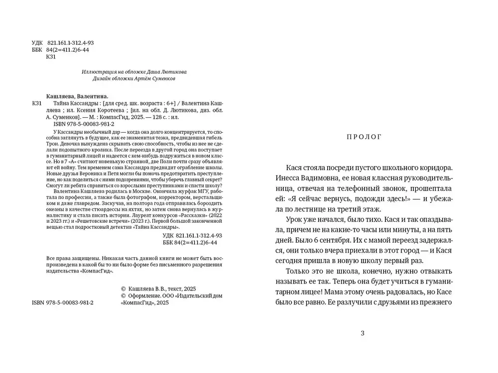 У Кассандры необычный дар ― когда она долго концентрируется, то способна заглянуть в будущее, как ее знаменитая тезка, предвидевшая гибель Трои. Девочка вынуждена скрывать свою способность, чтобы из нее не сделали подопытного кролика. После переезда в другой город она поступает в гуманитарный лицей и надеется с кемнибудь подружиться в новом классе. Но в 7 «А» считают новенькую странной, две Поли почти сразу объявляют ей вой ну. Тем временем сама Кассандра предвидит ограбление школы. Новые друзья Вероника и Петя могли бы помочь предотвратить преступление, но как поделиться с ними подозрениями, чтобы уберечь главный секрет? Смогут ли ребята справиться со взрослыми преступниками и спасти школу?