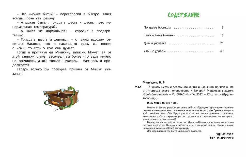 Мишка и Валька решили готовить себя к «будущим героическим путешествиям в интересах всего человечества». А это значит, что братьев впереди ждёт весёлое лето и множество удивительных приключений. Они будут испытывать себя на прочность, учиться читать мысли на расстоянии, ужинать с удавом… Правда, окружающие от их «подвигов» почему-то не в восторге… Невероятно, но факт: у Мишки, инициатора всех этих авантюрных затей, температура всегда тридцать шесть и девять. Может быть, это нормально для будущего «героического путешественника»?..