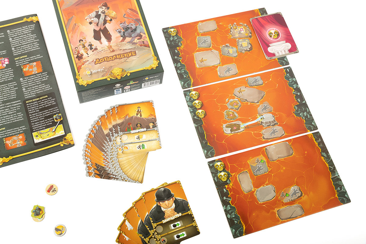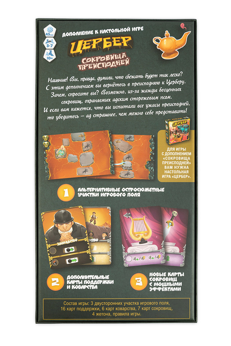Вырваться из лап Цербера не просто, вы можете применить разные тактики: действуйте в интересах группы или убегайте в одиночку, старайтесь создать временные союзы или рассорить команду героев. "Цербер. Сокровища преисподней" - дополнение к игре "Цербер". Для игры вам потребуется базовая коробка. В этом дополнении вы найдете всё необходимое, чтобы настроить игру под ваше настроение и манеру. Новые карты поддержки и коварства используются по обычным правилам игры, их можно использовать отдельно от других дополнений. Добавьте в игру немного упорства, дерзости, желания найти крайнего, и конечно, капельку злорадства. Новые участки игрового поля увеличивают разнообразие вариантов пути из преисподней. Участки различаются степенью сложности, а также игровыми правилами. Вам встретится "Дьявольский уклон", "Гнездо гарпий", "Врата смерти", "Омут Сирены" и другие потрясающе тёмные места, из которых хочется побыстрее сбежать (если вы не Цербер, конечно). Они могут быть использованы отдельно от других дополнений (за исключением участка с Пещерой чудес). Карты сокровищ - это новый элемент в игровой механике. Они имеют цену и обладают мощными эффектами. Разыграв такую карту, передайте её следующему участнику. То есть такие карты всегда остаются в игре, пока Цербер не настигнет их обладателей.