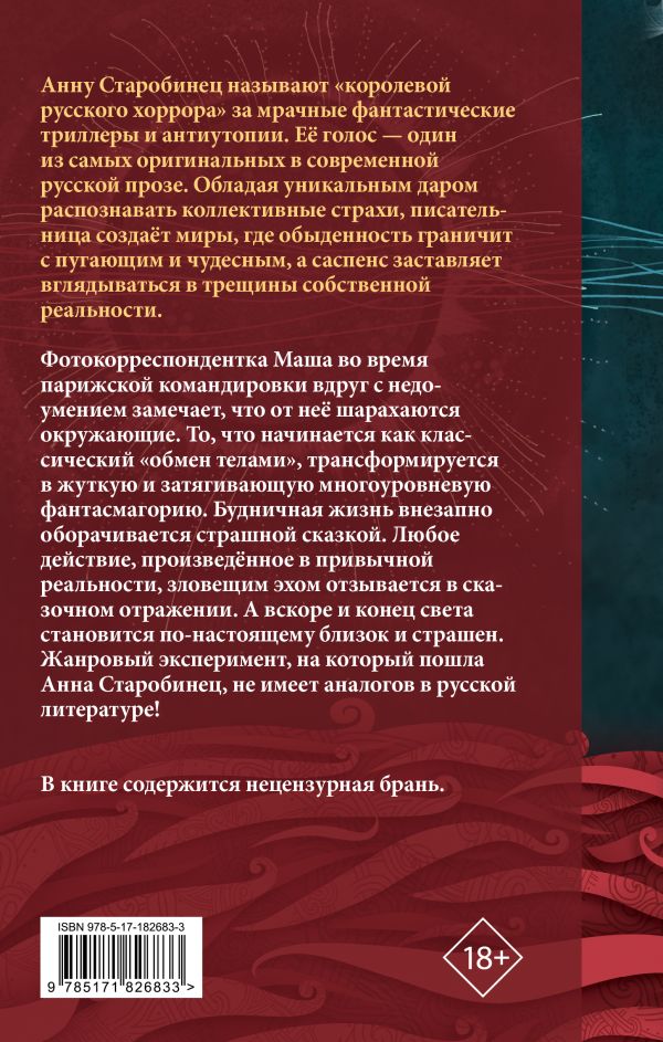 – Остросюжетный метафизический триллер и фантасмагория, в которой будничная серость внезапно оборачивается кошмаром. От автора книг «Лисьи броды», «Живущий», «Переходный возраст».– Главная героиня Маша, фотокорреспондентка, сталкивается с необъяснимыми изменениями в восприятии, когда привычные действия отражаются в другой, загадочной реальности.– Символично и зловеще: одно событие способно повлиять на оба мира, а близкая угроза конца света становится всё более ощутимой.– Автор мастерски использует фобии, страхи и «разломы» повседневности, обнажая под ними глубинные человеческие тревоги.– Анну Старобинец называют «королевой русского хоррора». Ее голос — один из самых оригинальных в современной русской прозе. Обладая уникальным даром распознавать коллективные страхи, писательница создает миры, где обыденность граничит с пугающим и чудесным. Тексты Старобинец переведены на несколько языков и принесли ей премию «Лучший писатель Европы» Конгресса Европейского общества научной фантастики.
