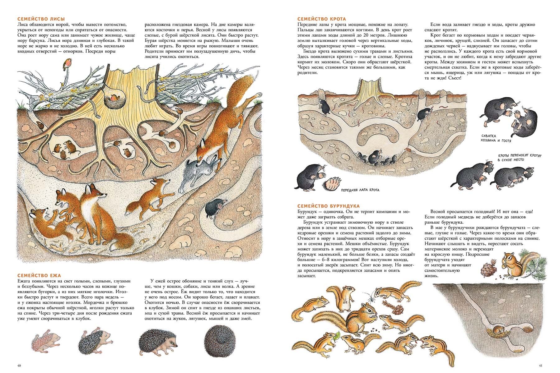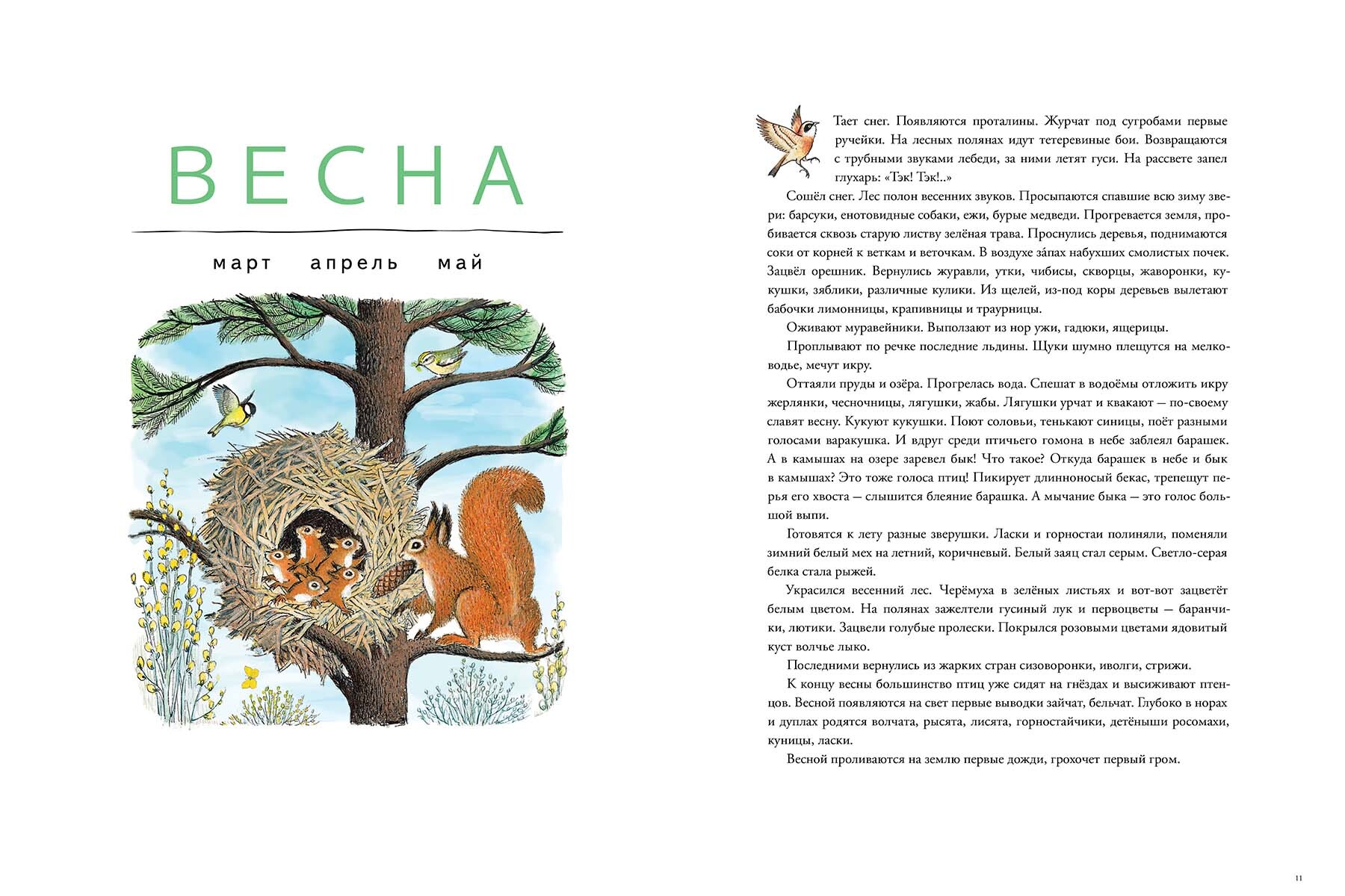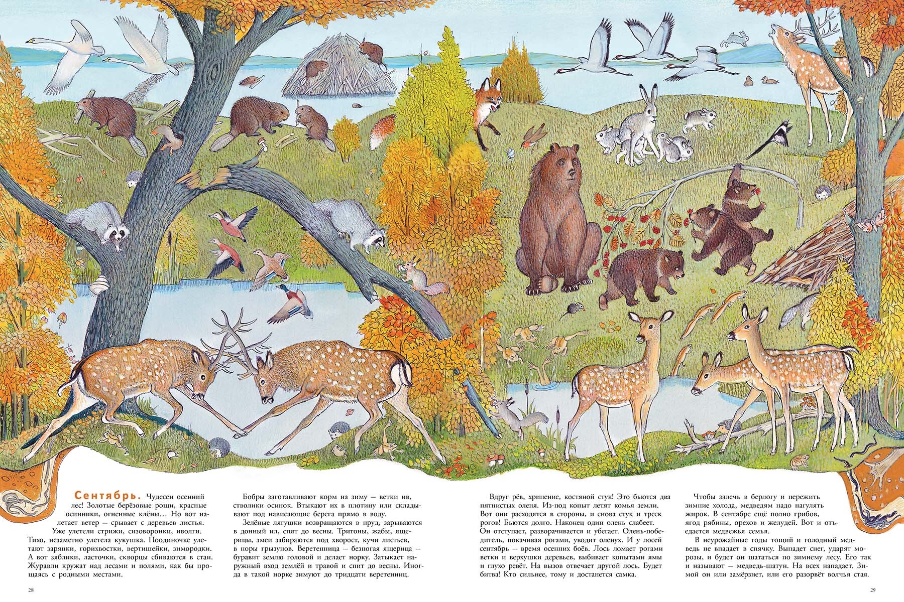 Разворотные иллюстрации, посвящённые каждому месяцу в году, не просто выразительны и живописны, они еще и абсолютно точны с зоологической точки зрения. За зимой приходит весна, вслед за весной – лето и осень… Вокруг маленького читателя ходят медведи, олени, лоси, белки, лисы, зайчата, рыси. Птицы строят гнезда, звери роют норы. Птенцы выбираются из яиц, головастики – из икринок, зверята сосут материнское молоко.