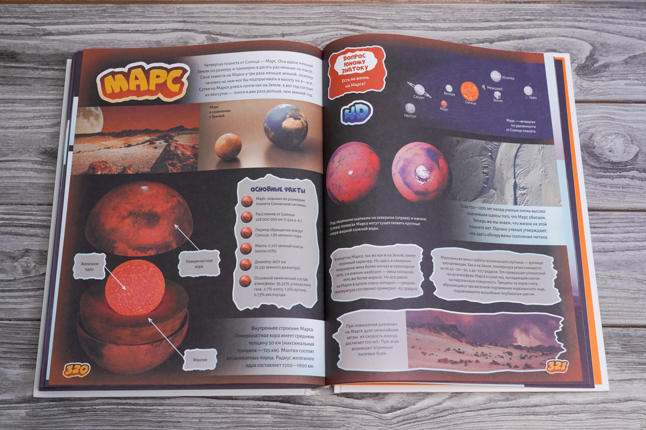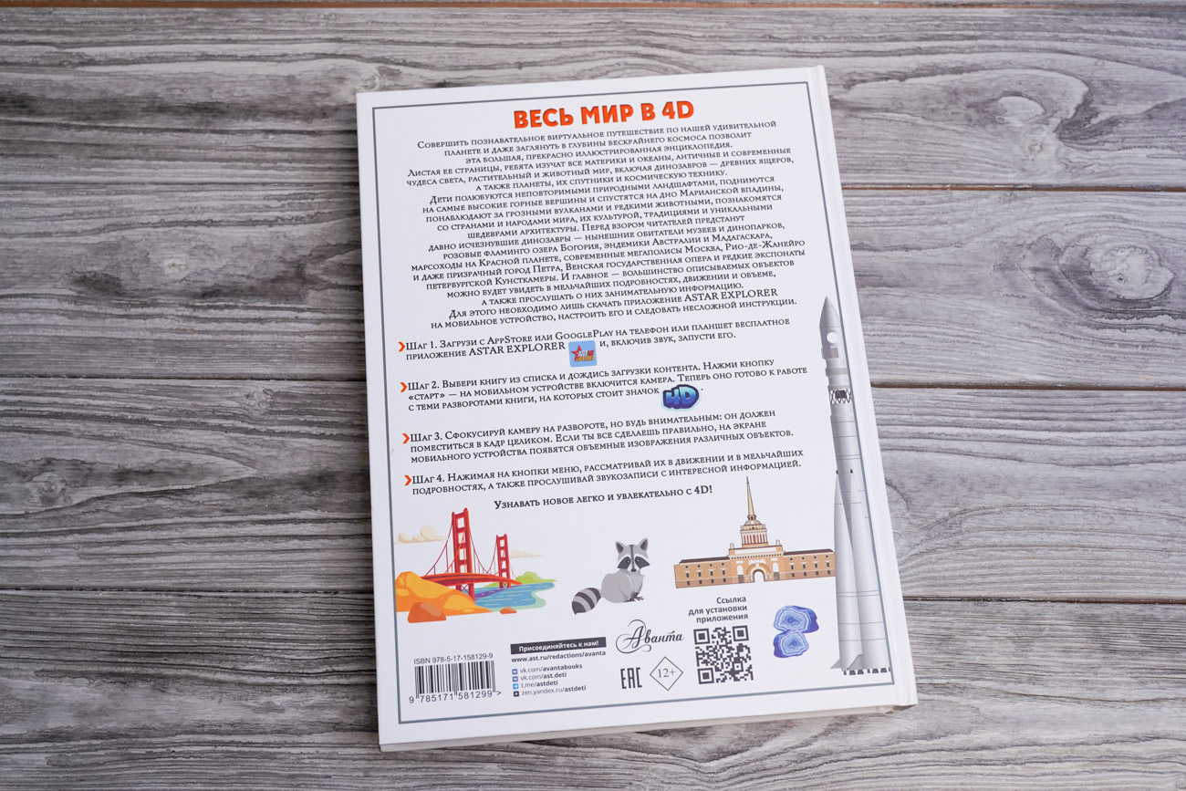 Эта большая детская энциклопедия подготовлена в не совсем привычном для читателя формате — здесь используются 4D-технологии, с помощью которых он сможет рассмотреть представленные объекты и явления в мельчайших подробностях, движении и объеме. В книге описаны материки и океаны, острова, реки и озера, горы и вулканы, степи и пустыни, климатические особенности и явления, страны и народы их населяющие, чудеса света древние и современные, животный и растительный мир нашей планеты, Вселенная и космос. Таким образом, эту энциклопедию можно смело назвать гигантской — как по объему, так и по широте охватываемых тем. Выдающиеся архитектурные сооружения, неповторимые природные ландшафты, космические тела, явления и технику, удивительных зверей, птиц и рептилий читатель не только увидит на многочисленных иллюстрациях, сопровождающих тексты, но и услышит о них занимательную информацию, использовав возможности дополненной реальности. Для этого ему нужно будет скачать на мобильное устройство приложение ASTAR EXPLORER и действовать согласно инструкции.