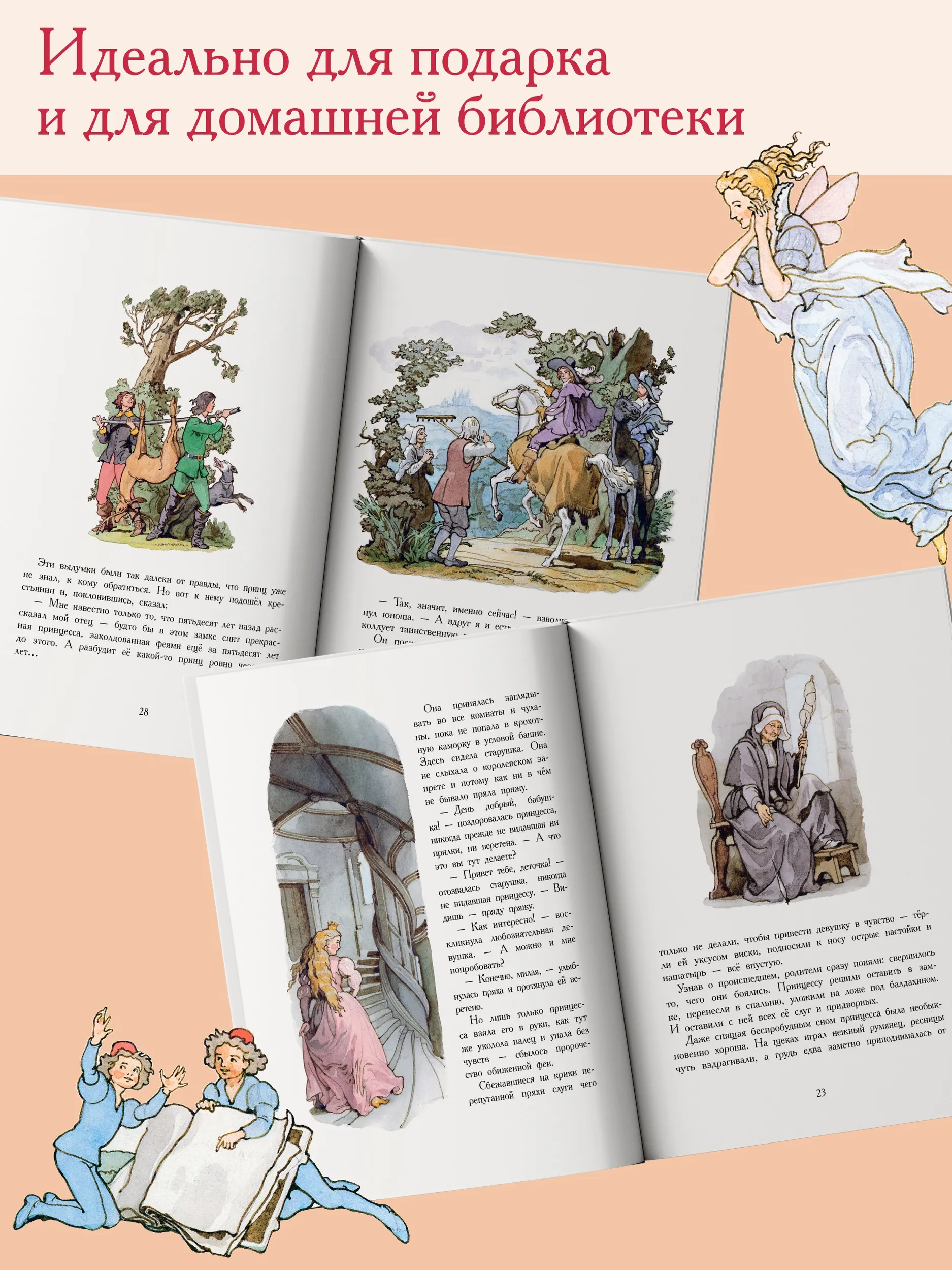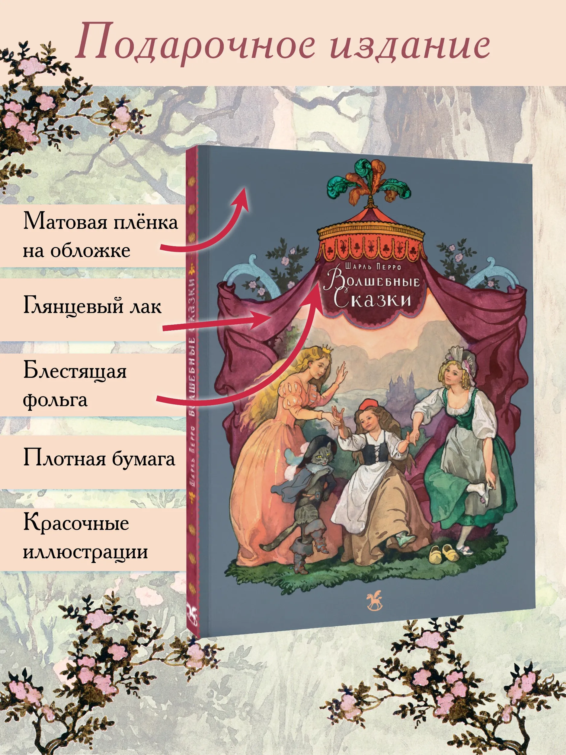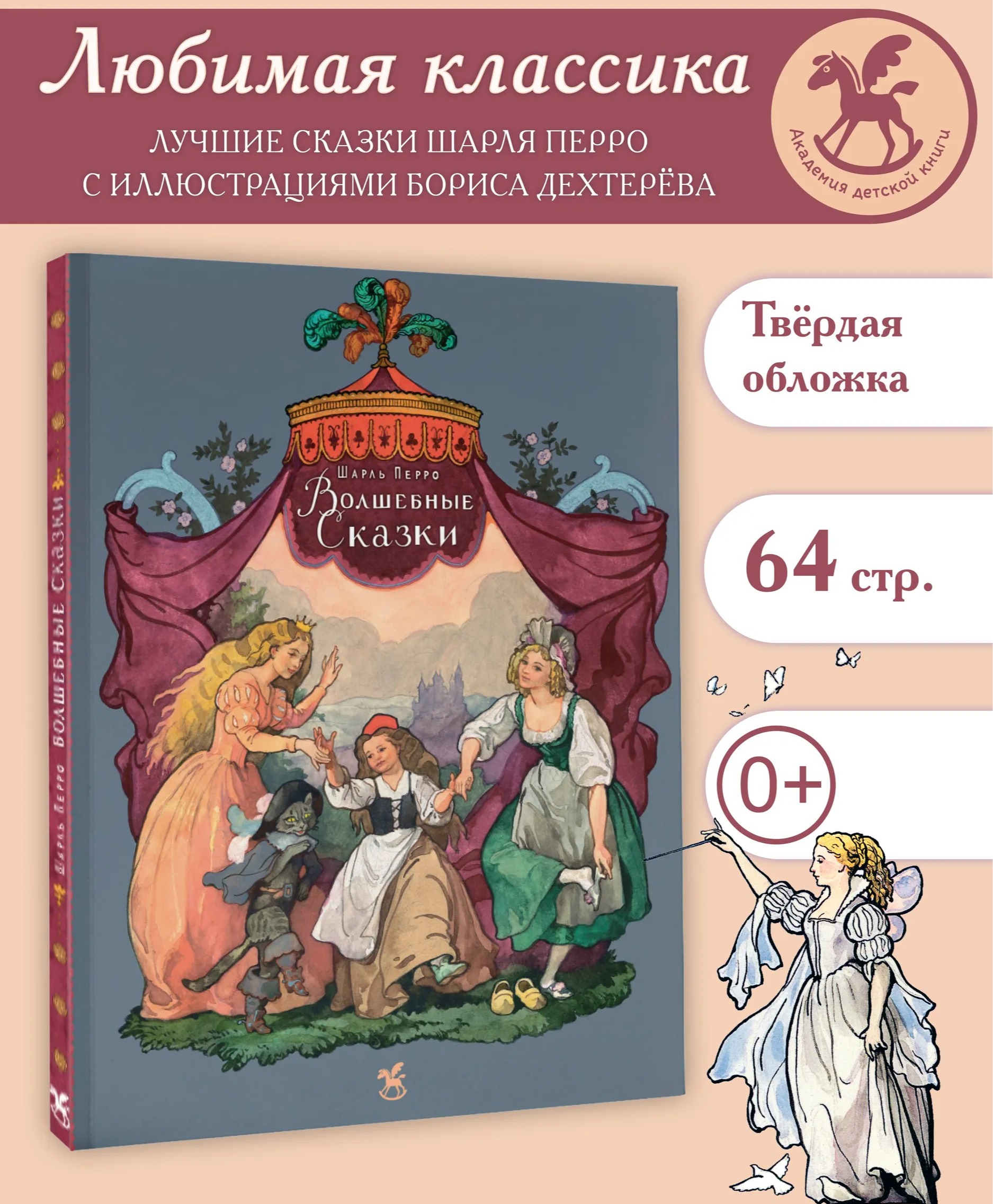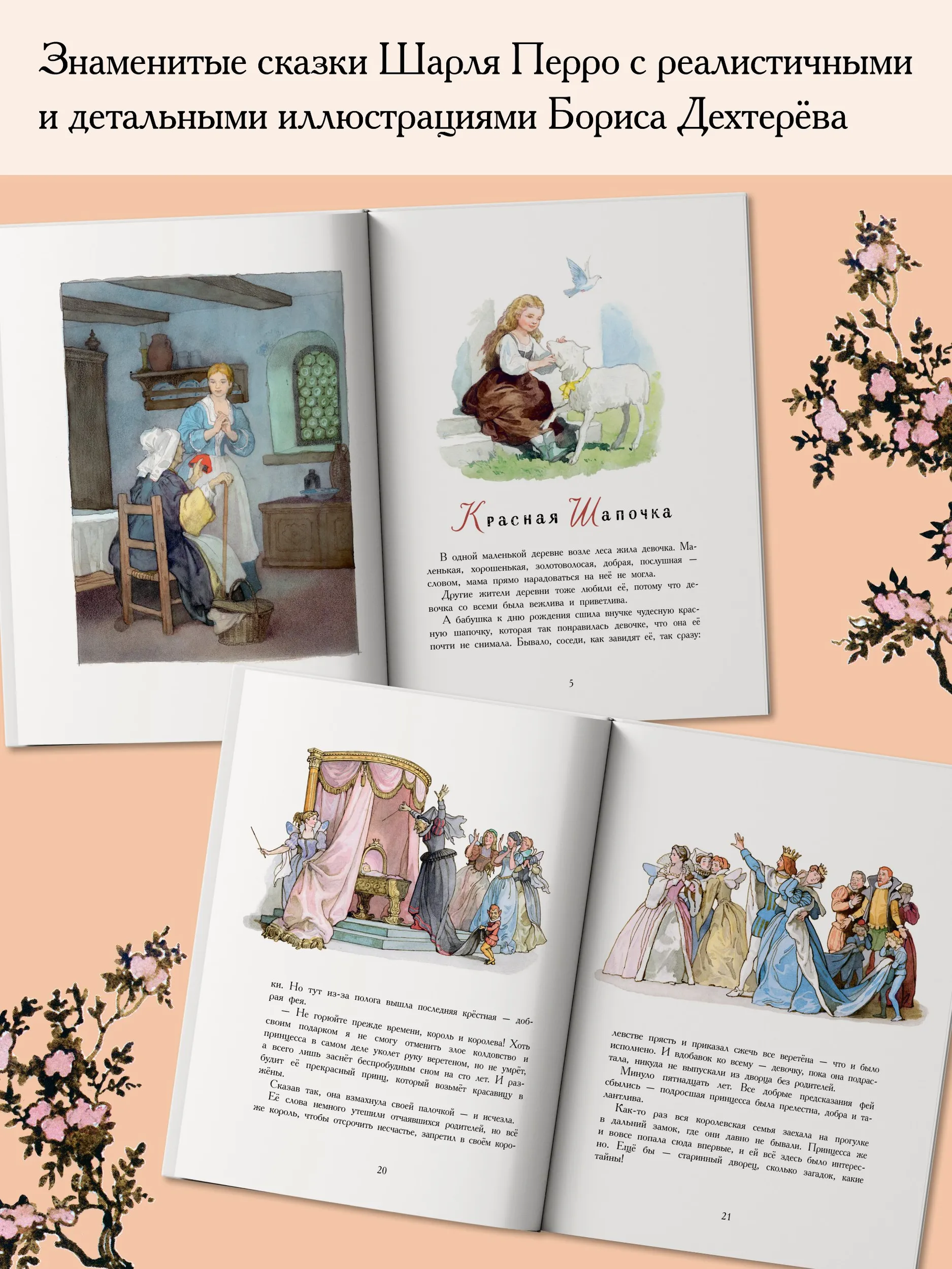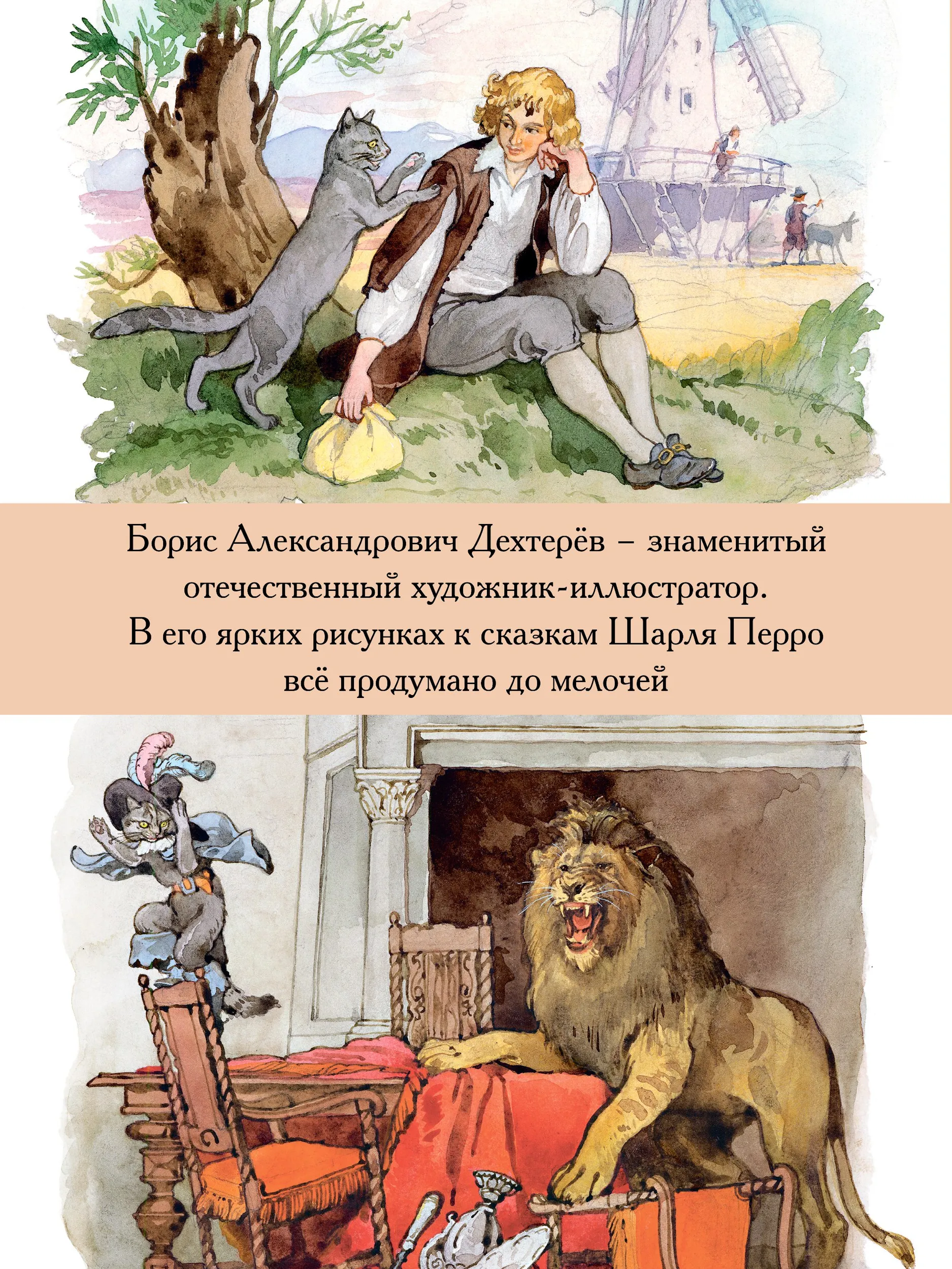 В эту книгу вошли знаменитые сказки Шарля Перро: «Красная Шапочка», «Спящая красавица», «Золушка» и «Кот в сапогах». Иллюстрации к этим сказкам нарисовал знаменитый отечественный художник-иллюстратор Борис Александрович Дехтерёв. Он был главным художником в издательстве «Детская литература», и его кисти принадлежат иллюстрации к произведениям А.С. Пушкина, М.Ю. Лермонтова, М. Горького, А. Гайдара и других писателей. Борис Дехтерёв опирался на русскую реалистическую иллюстрацию и виртуозно владел техникой акварели. Предметы быта, одежда, – всё в иллюстрациях Б.А. Дехтерёва продуманно и соответствует изображаемому времени. Сказки печатаются в переводе В. Берестова и пересказе М. Михайлова.
