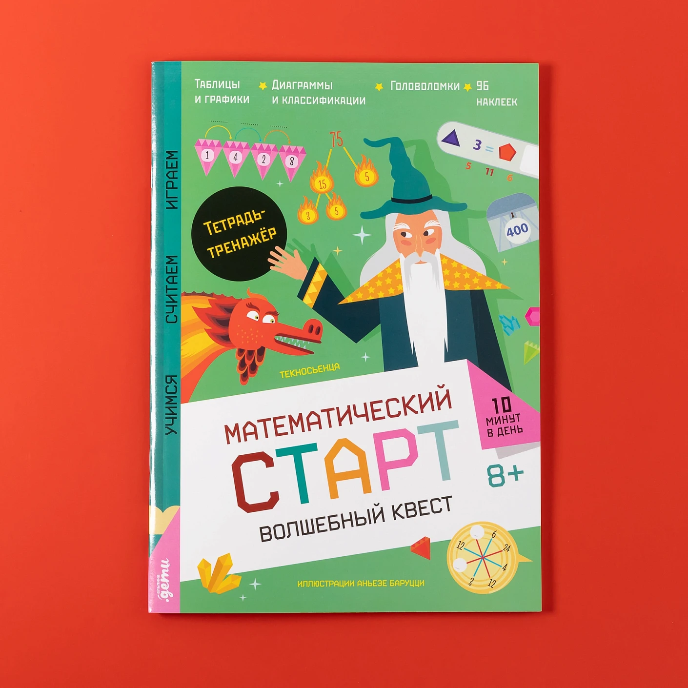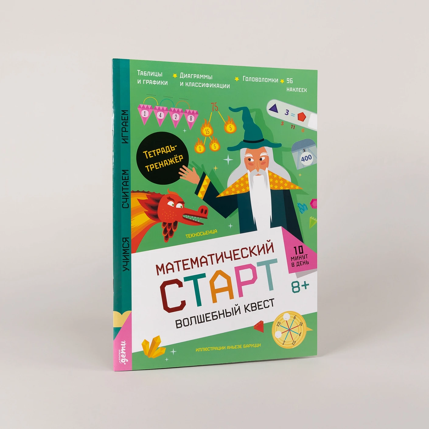 Математический старт. Волшебный квест — тетрадь-тренажёр, которая поможет ребёнку от 8 лет без страха и скуки освоить мир чисел, таблиц, графиков и научиться анализировать данные.