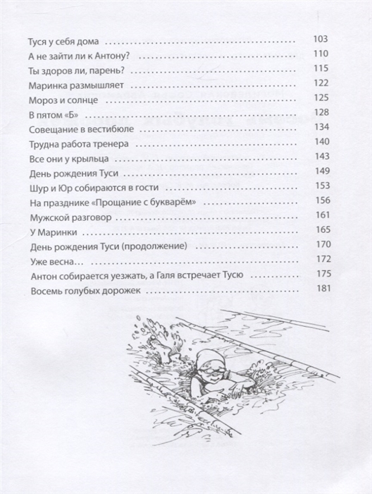Главные герои книги, первоклассница Марина и пятиклассник Антон, занимаются плаванием. Их ждёт множество приключений и даже испытаний, причём не только в бассейне с восьмью голубыми дорожками, но и в школе, и в повседневной жизни. Увлекательная и трогательная повесть Софьи Могилевской – о настоящей дружбе, она учит мужеству и честности в любых обстоятельствах.