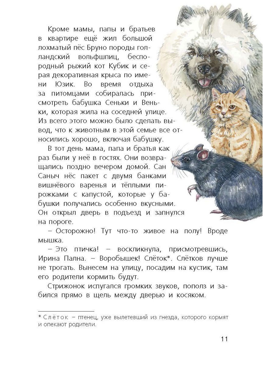 В этой книге - две правдивые, забавные и трогательные истории о взаимоотношениях диких птиц и людей. В самом обыкновенном городе, на асфальтированных улицах, среди каменных домов обитает множество удивительных живых существ. Нужно только внимательнее смотреть... Стрижонок выпал из гнезда. К счастью, он попал в добрые человеческие руки. Вырастить такого птенца очень трудно, но если за дело возьмутся неравнодушные люди, у него есть шанс однажды подняться в небо... Вороны Кра и Мартина - старые приятели Юли. Каждый день, отправляясь в школу, она наблюдает за ними, подкармливает и даже беседует с птицами. Однажды у ворон появляются птенцы, и Юле становится совершенно некогда заниматься учебой - ей надо считать ворон!.. Книга украшена очень реалистическими и в то же время живыми и веселыми иллюстрациями Алины Сканцевой. Для младшего и среднего школьного возраста.