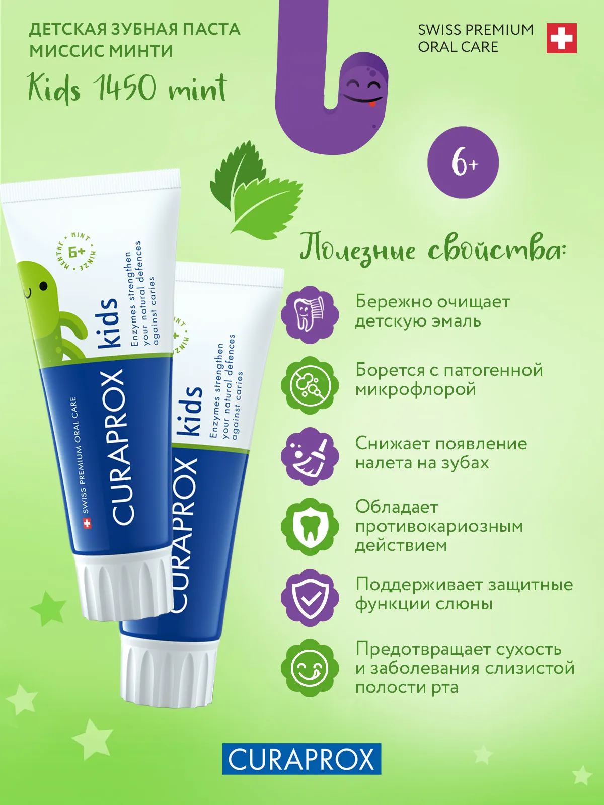 Детская зубная паста Kids со вкусом мяты, предназначена для детей с 6 лет и старше. Зубная паста поддерживает защитные функции слюны, естественно и нежно очищает детскую эмаль зубов, снижает риск появления налета на зубах, надолго обеспечивает свежесть дыхания, уничтожает болезнетворные бактерии, обладает противокариозным действием, предотвращает заболевания слизистой полости рта и устраняет сухость.